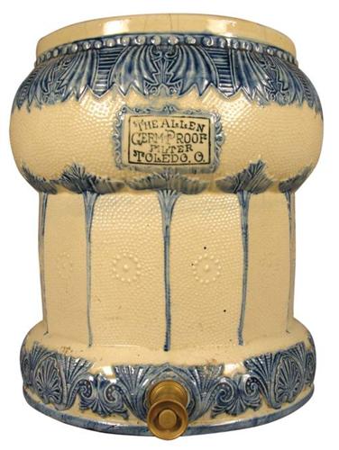Allen Germ Proof Filter Stoneware Glazed Dispenser, Toledo, OH. Some chips on back side of rim, no lid otherwise excellent condition. 12 inch dia. X 14 inches tall.