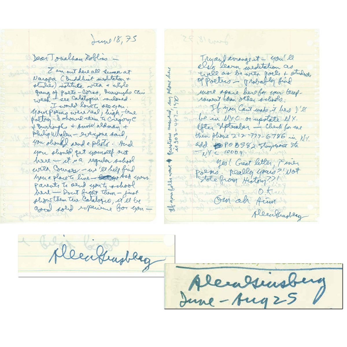 Allen Ginsberg autograph letter signed, dated 18 June 1975 from the Naropa Buddhist Meditation Center in Colorado. Addressed to poet Jonathan Robbins, letter reads in part: ''...I am out here all summer at Naropa...with a whole gang of poets - Corso, Burroughs this week...Your poems were real, high, true poetry. I showed them to Gregory C[orso] & Burroughs & Anne Waldman & Philip Whalen...'' Includes original envelope addressed in Ginsberg's hand and signed in return address. Measures 8'' x 10'' on two pages, front and verso. Near fine.