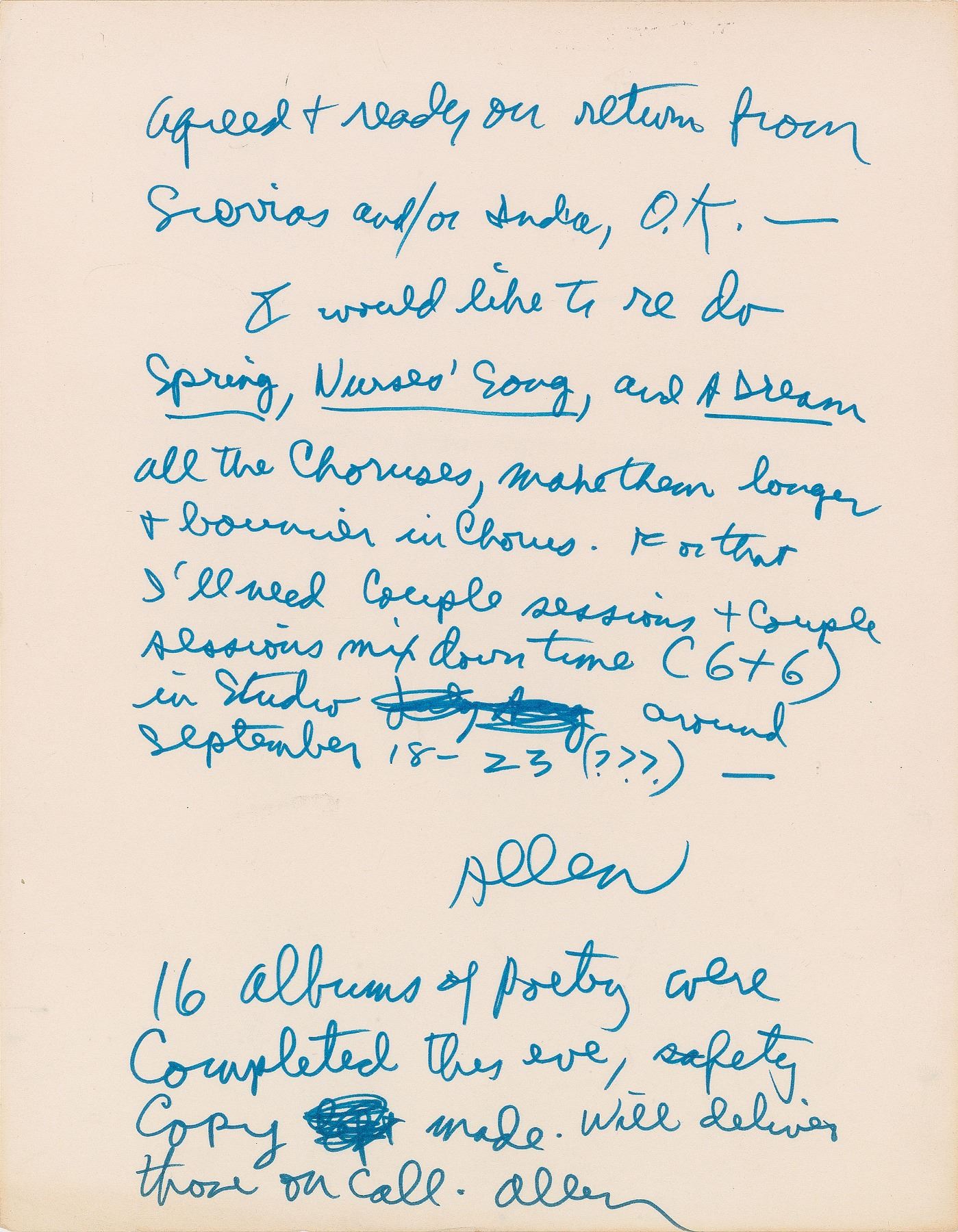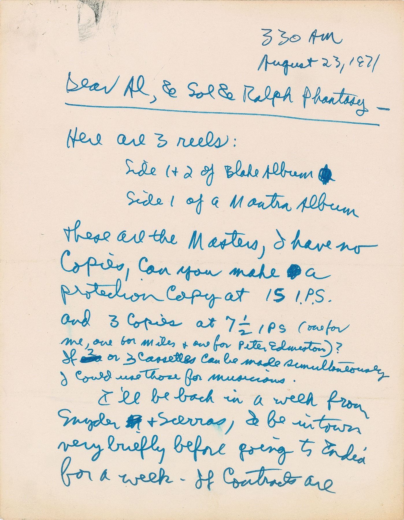ALS signed “Allen,” two pages, 8.5 x 11, August 23, 1971. Written at "330 AM," a letter to "Al, & Sol & Ralph Phantasy" (Al Bendich, Sol Zaentz, and Ralph J. Gleason of Fantasy Records), in regard to contracts and rerecordings for his 'Songs of Innocence and Experience' and 'Mantra' projects, in full: "Here are 3 reels: Side 1 & 2 of Blake album, Side 1 of a Mantra album, These are the Masters, I have no copies, can you make a protection copy at 15 I.P.S. and 3 copies at 7 1/2 IPS (one for me, one for Miles & one for Peter Edmiston)? If 2 or 3 cassettes can be made simultaneously I could use those for musicians. I'll be back in a week from Snyder & Sierras, & be in town very briefly before going to India for a week. If contracts are agreed & ready on return from Sierras and/or India, O.K.—I would like to re do Spring, Nurse's Song, and A Dream, all the choruses, make them longer & bouncier in chorus. For that I'll need couple sessions & couple sessions mix down time (6 & 6) in studio around September 18–23 (???)—." Ginsberg signs his name again, "Allen," at the conclusion of his postscript: "16 albums of poetry were completed this eve, safety copy made. Will deliver those on call." Includes three printouts for the running order and liner notes for the two referenced albums, "Allen Ginsberg: Blake / Mantra Album II," which bears felt tip notations on the first page by Ginsberg, "re record at Fantasy," which he writes again below, and on the third page in the lower border, "Add another side of Mantras, 23 min, Om Sri Maitreya, Kare Krishna, etc." In fine condition, with scattered light creasing and some light stains.