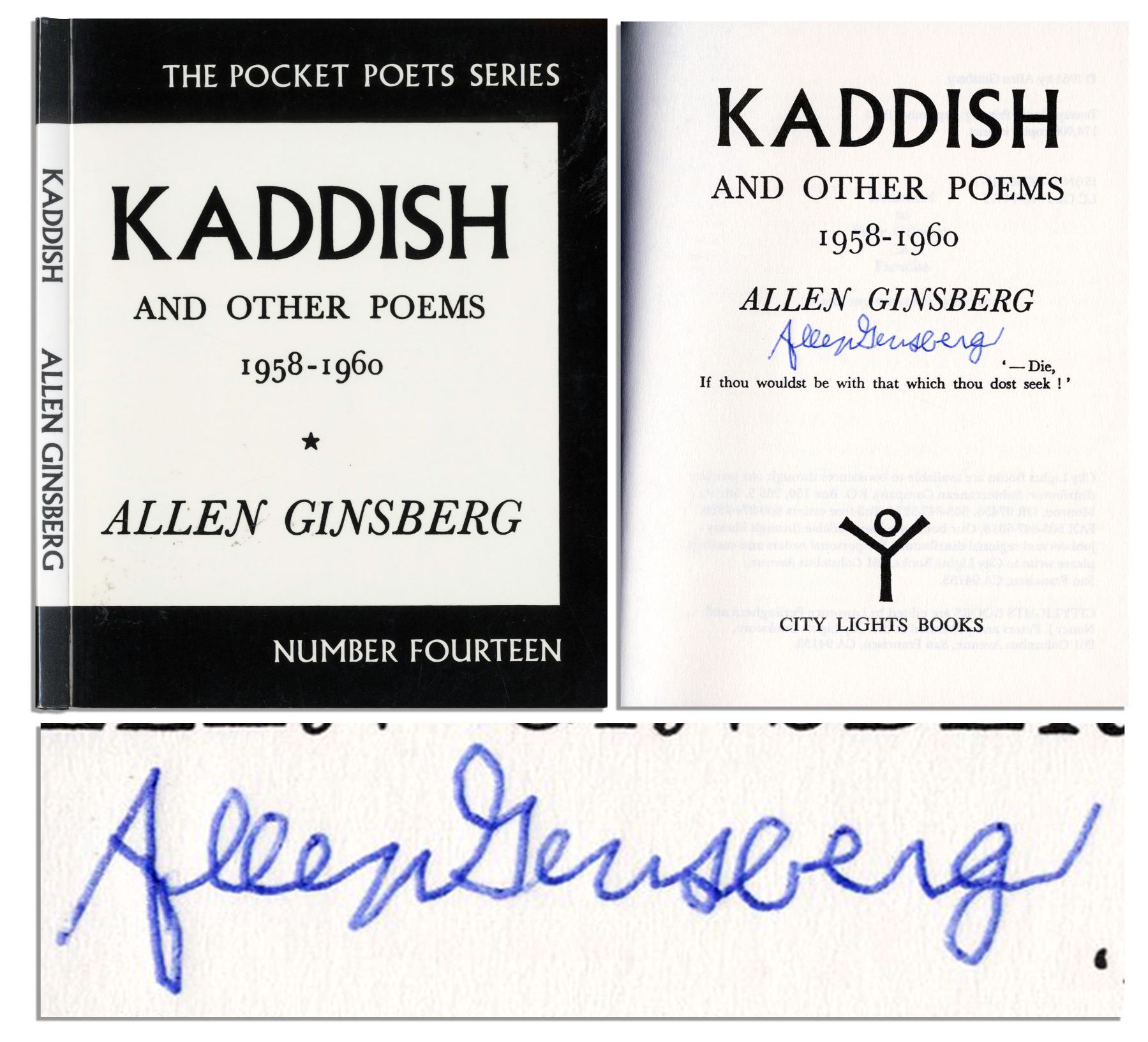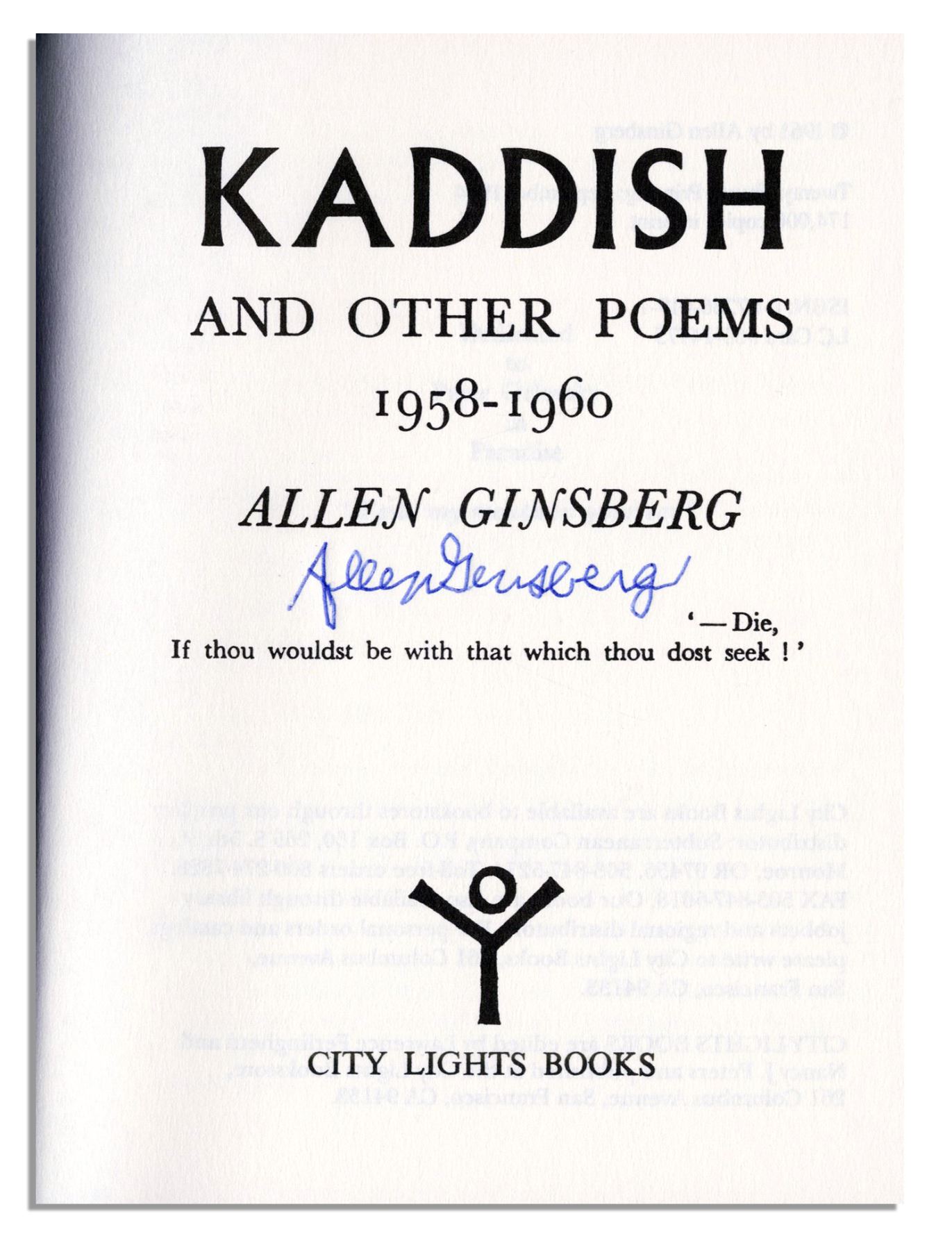 Allen Ginsberg, foremost Beat poet signed copy of ''Kaddish & Other Poems''. City Lights Books: San Francisco: 1961. Signed in blue ink ''Allen Ginsberg'' underneath his printed name upon the title page. Measures 5'' x 6.25''. Softcover book has some soiling to the covers, else near fine.