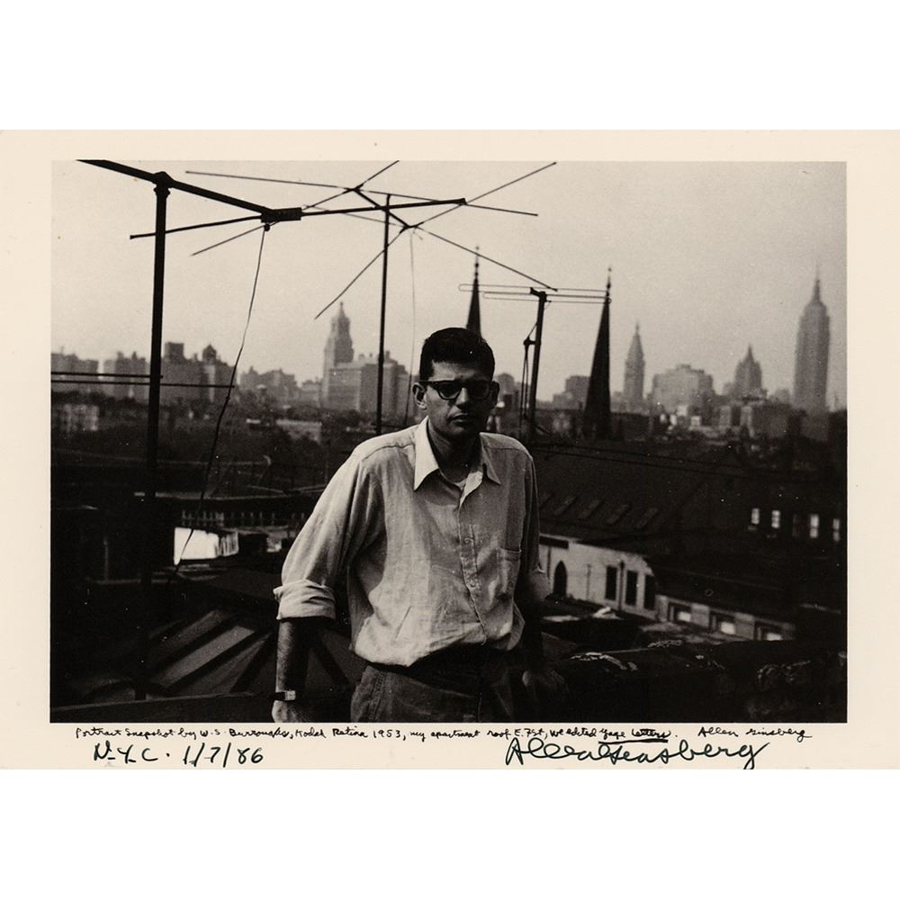 Nice 6 x 4.25 postcard photo of Ginsberg in New York City, taken by William Burroughs in 1953, signed in the lower border in black ballpoint, "N.Y.C. 1/7/86, Allen Ginsberg." Also bears a facsimile caption and signature in the lower border. In very fine condition.