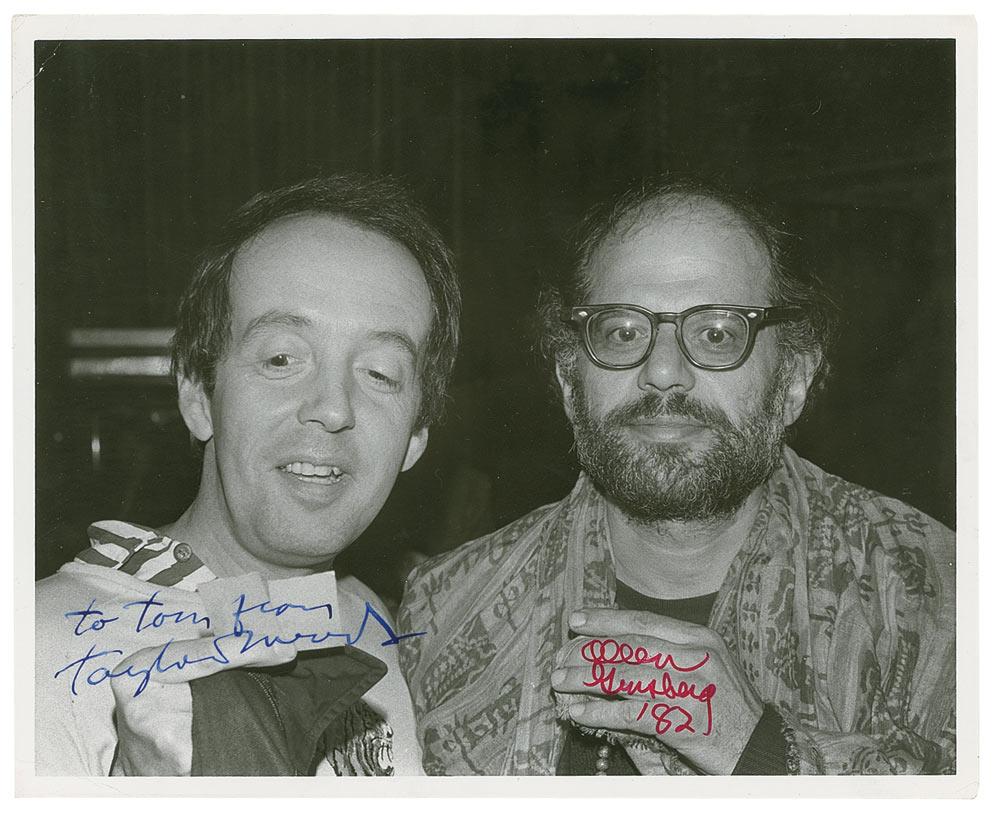 Glossy 10 x 8 photo of Ginsberg and Mead posing together, signed in red felt tip by Ginsberg and signed and inscribed in blue ink by Mead. In fine condition, with scattered spotting to emulsion and a crease to both left corners.
