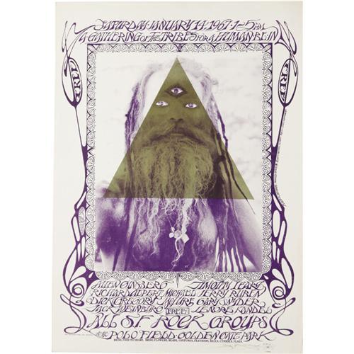 <B>Allen Ginsberg and Timothy Leary "Gathering of the Tribes" Human Be-In Poster (1967).</B></I> Expand your consciousness (and your poster collection) with this trippy event poster featuring speakers like Jerry Rubin, Michael McClure, Dick Gregory, Richard Alpert, and more, set in San Francisco's Golden Gate Park Polo Field. Thirty thousand people attended this January, 1967 event, which included unbilled performances by Grateful Dead and Jefferson Airplane, and resulted in Allen Ginsberg being declared the "Elder Statesman" of the hippie generation. This poster's "third eye" graphics were designed by Stanley Mouse, who added his distinctive "running rodent" signature in pencil to the lower border. The poster measures 14.25" x 20", and is in Near Mint condition. The "Summer of Love" got its early start right here on this cool Saturday event!