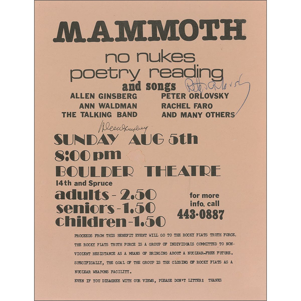 Flyer for a No Nukes Poetry Reading and Songs at the Boulder Theatre, 8.5 x 11, signed in black ink by Ginsberg and in blue ballpoint by poet Peter Orlovsky. In fine condition, with scattered light creasing and a small spot of soiling towards the center.