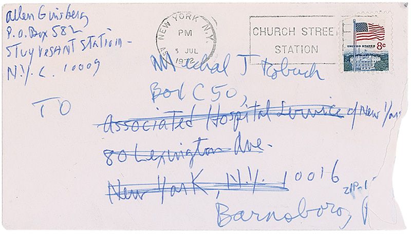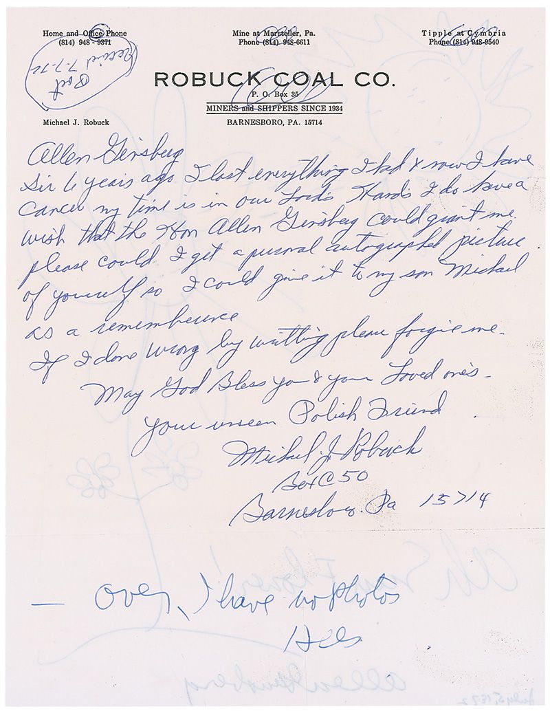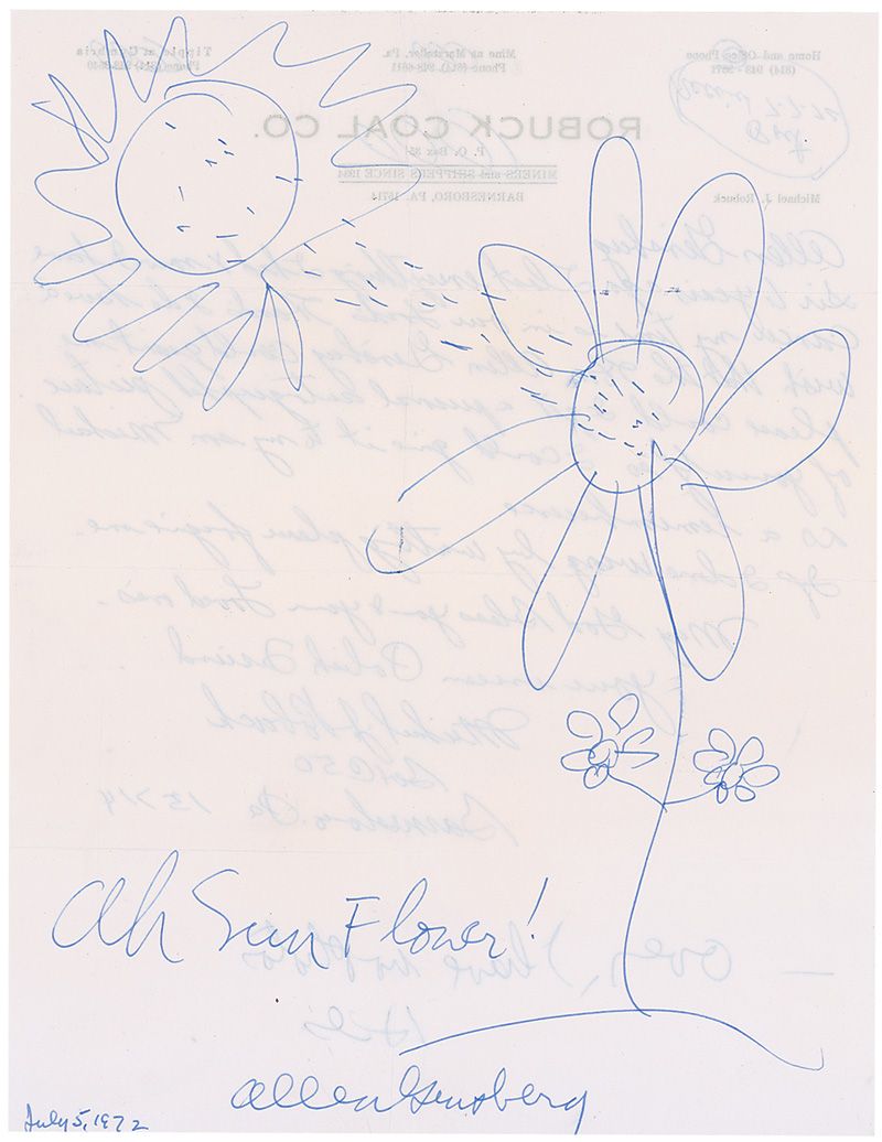 Original signed ballpoint sketch of a sun and sunflower on the reverse of a white 8.5 x 11 letter to Ginsberg, with caption and signature to the bottom, “Ah Sun Flower! Allen Ginsberg.” Intersecting folds, one vertical fold through the signature, and show-through from the admirer’s original letter on reverse, otherwise fine condition. Accompanied by the original mailing envelope.