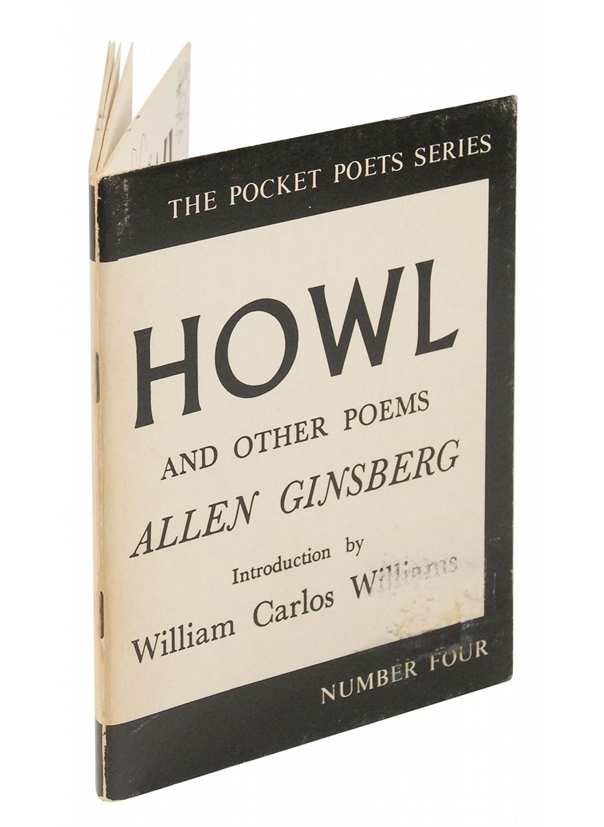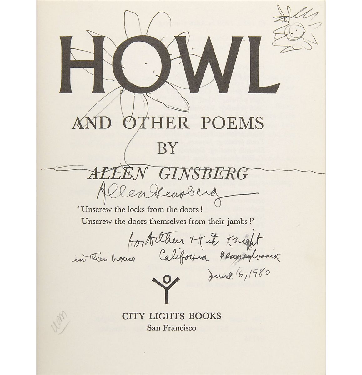 Signed book: Howl and Other Poems. Later printing. San Francisco: City Lights Books, 1959. Softcover, 5 x 6.25, 44 pages. Signed and inscribed on the title page, “Allen Ginsberg, For Arthur and Kit Knight in their house in California, Pennsylvania, June 16, 1980,” drawing petals and stems around the “O” in Howl, and adding a sketch of a sun to the top right corner of the page. Autographic condition: fine. Book condition: VG-/None.