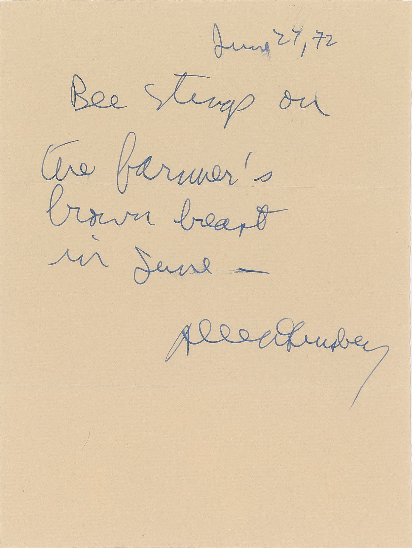 AQS on an off-white 5.75 x 7.75 sheet, in full: "Bee stings on the farmer's brown breast in June—." Signed below by Ginsberg, who adds the date above, "June 27, 72." In fine condition.