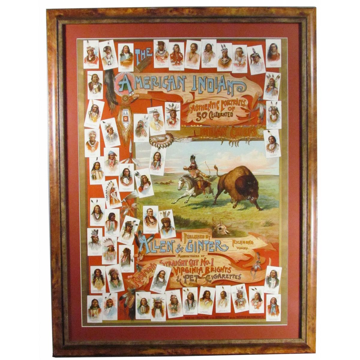 Allen & Ginter American Indians Paper Poster. Authentic Portraits of 50 Celebrated Indian Chiefs on tobacco cards. From the Collection in the Department of the Interior, Washington DC. Near mint condition. Framed under glass. 20 1/2 X 28 1/2 inches.