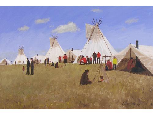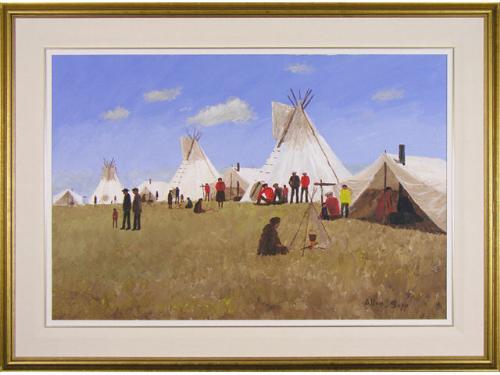 [Canadian RCA b. 1929] UNTITLED (LAST POWWOW OF THE SUMMER) Acrylic on canvas 24 x 36 ins. Signed