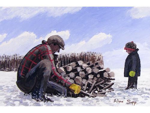 [Canadian RCA b. 1929] HE'S GOING TO TAKE SOME WOOD INSIDE; 2003 Acrylic on canvas 16 x 24 ins. -Signed, titled & dated