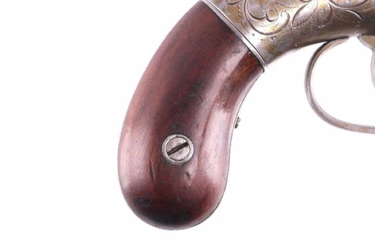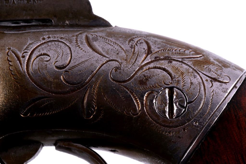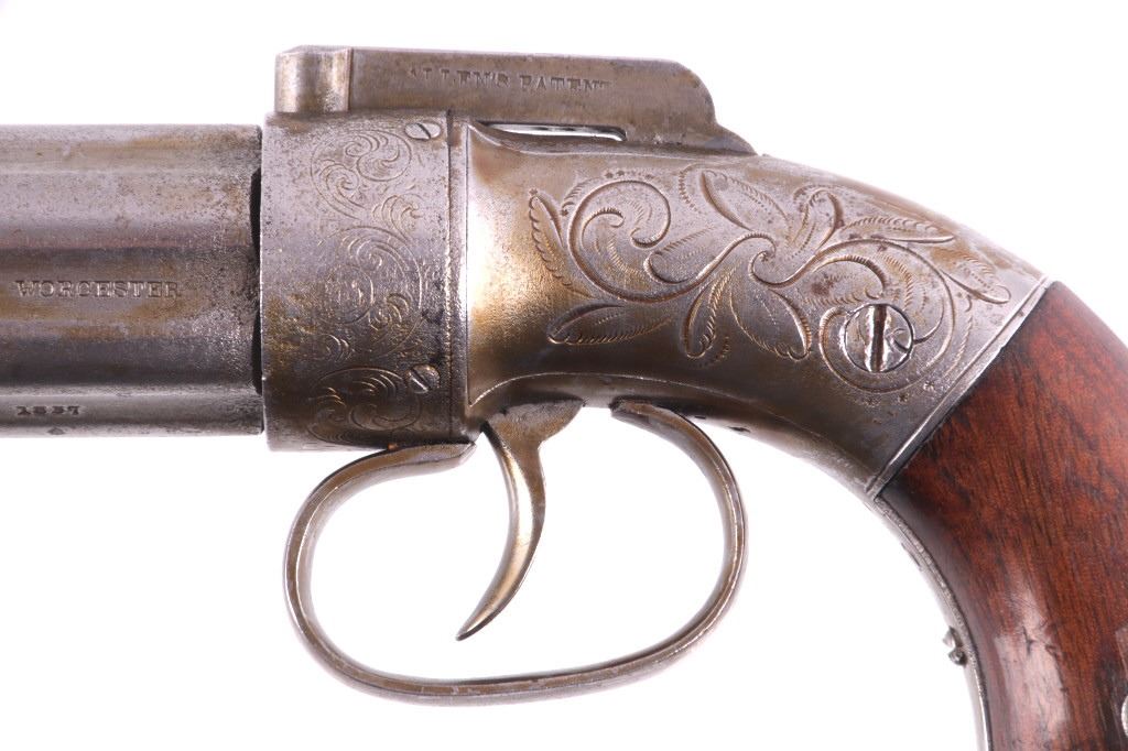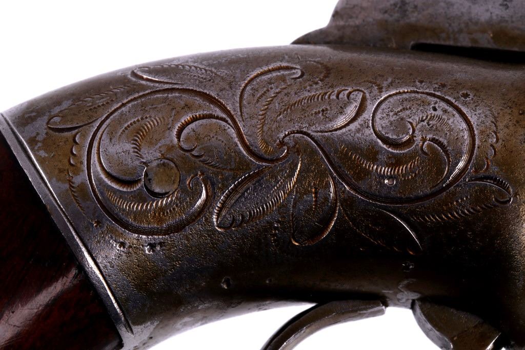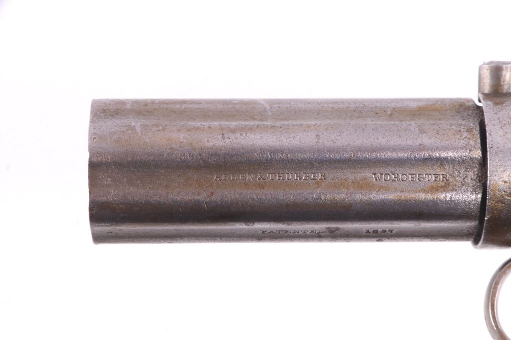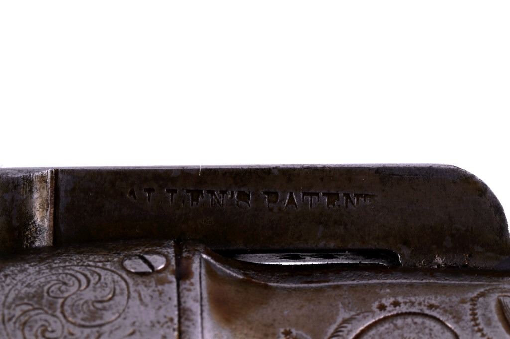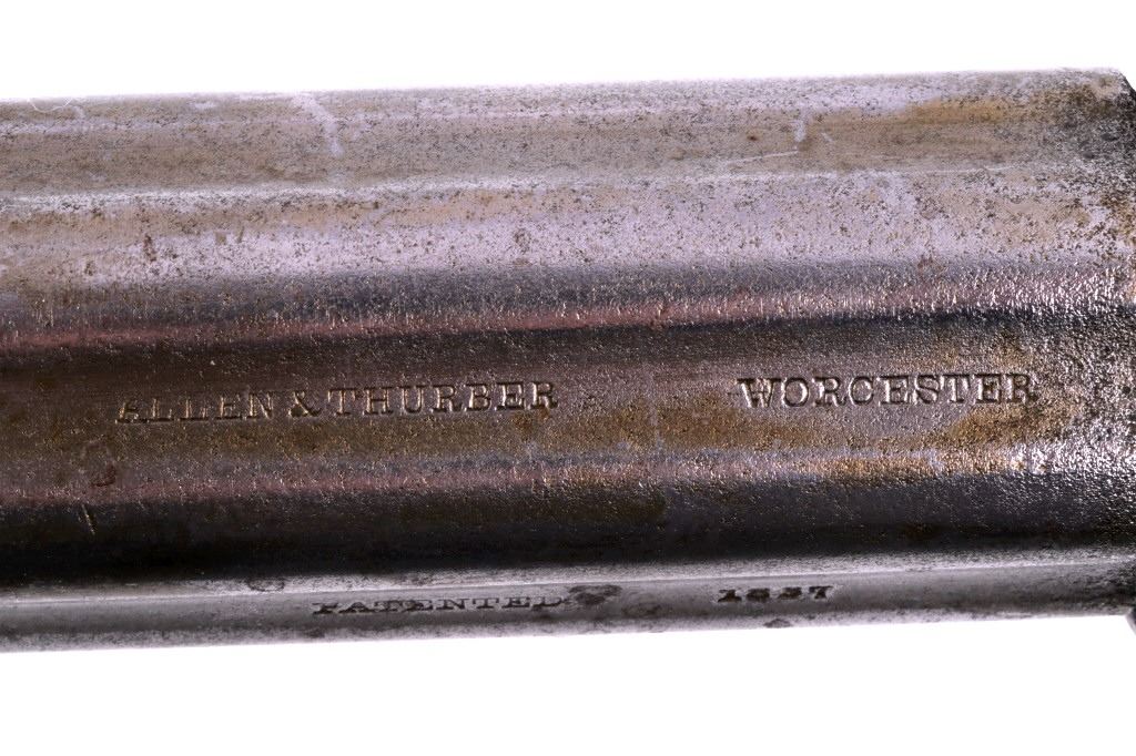 Included in this lot is a factory engraved Allen & Thurber six shot percussion “Pepperbox” revolving pistol, circa 1840’s, .32 caliber with 3 1/2" long early style ribbed barrels. This is the medium size Allen Pepperbox that found favor as a large pocket pistol and a holstered belt weapon. These early competitors to the Colt and Remington revolvers found favor with the “49ers” of California Gold Rush fame, western pioneers, and urban dwellers in need of a repeating firearm for self-defense. Many were carried as private weapons on both sides of the Civil War. Examples in fine condition are rare, as these handguns were often used for “daily carry” by their owners. This is a very fine example as it displays a lovely uncleaned patina and still retains traces of original brass finish on the barrels. The usual condition for one of these is heavily worn gray metal, at best, and, more often than not, badly rusted, pitted, and showing abuse. The frame is factory hand engraved, as are the nipple shield and back strap. This is a double action pistol, in which a single pull of the trigger revolves the barrel cluster, raises the bar-style hammer, and fires the gun. The bar hammer is marked “ALLENS PATENT”; it is also marked on a flute between the barrels “ALLEN THURBER”, “WORCESTER”, and "Patented 1837 Cast Steel". The walnut grips are excellent and exhibit much of the original finish. The pistol displays excellent mechanical condition and is a truly fine example of a uniquely American firearm from the pre-Civil War period. The pistol shows mechanical action with a heavy trigger pull. Serial Number: 447. This firearm qualifies as an Antique and does not require FFL Transfer or NICS Background Check.