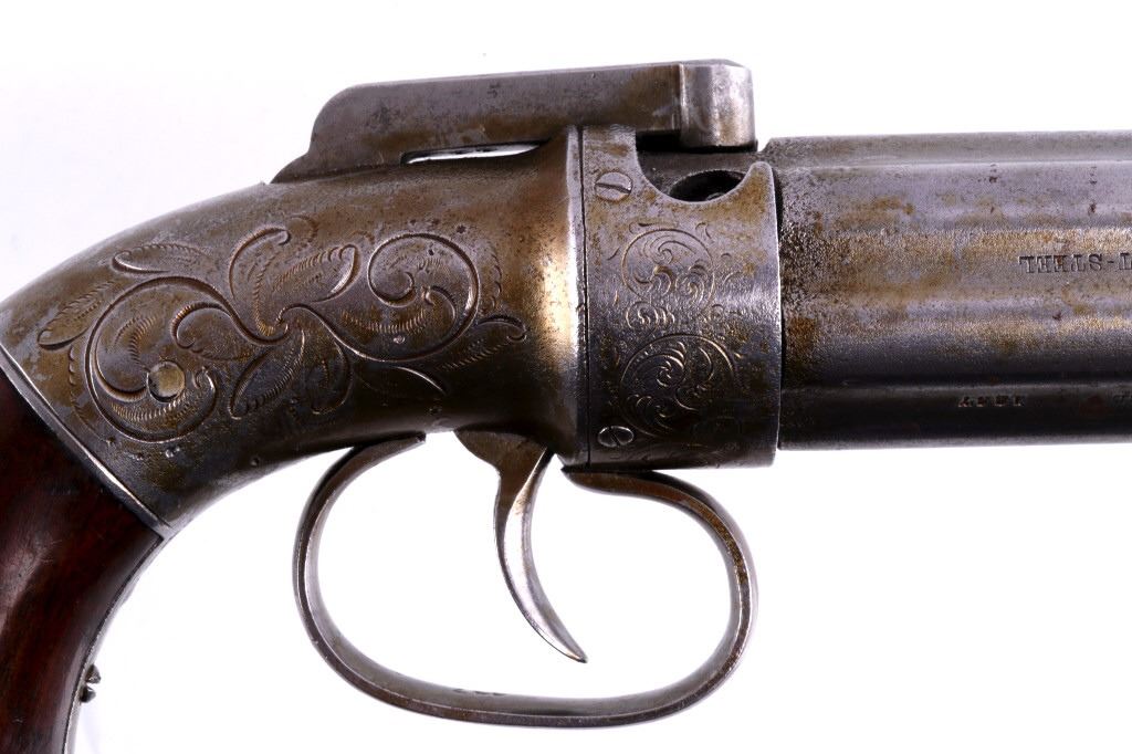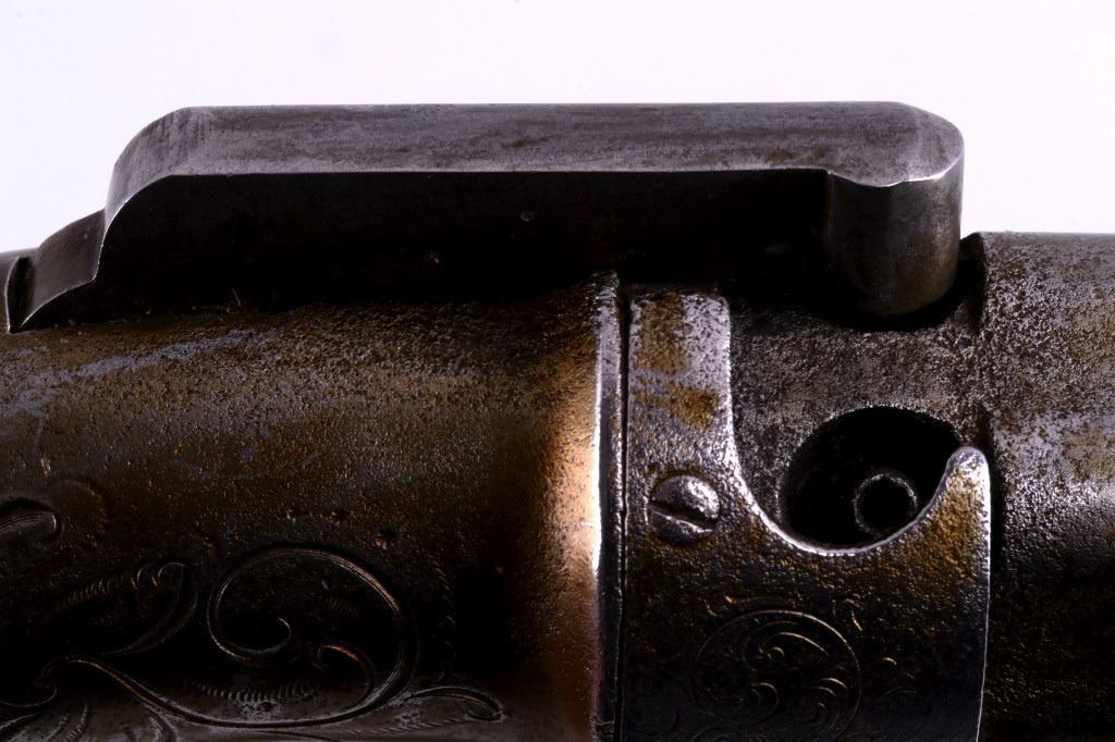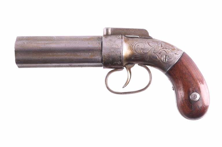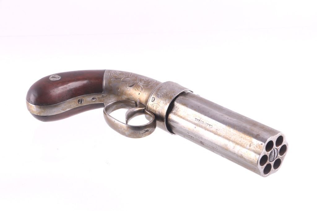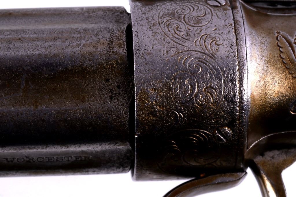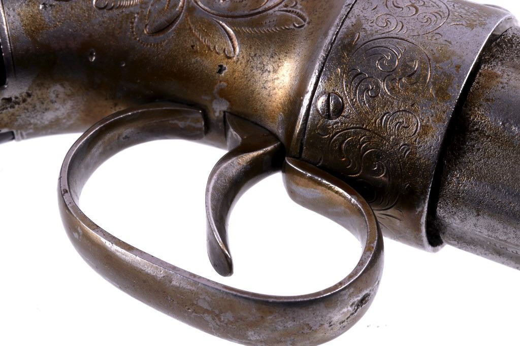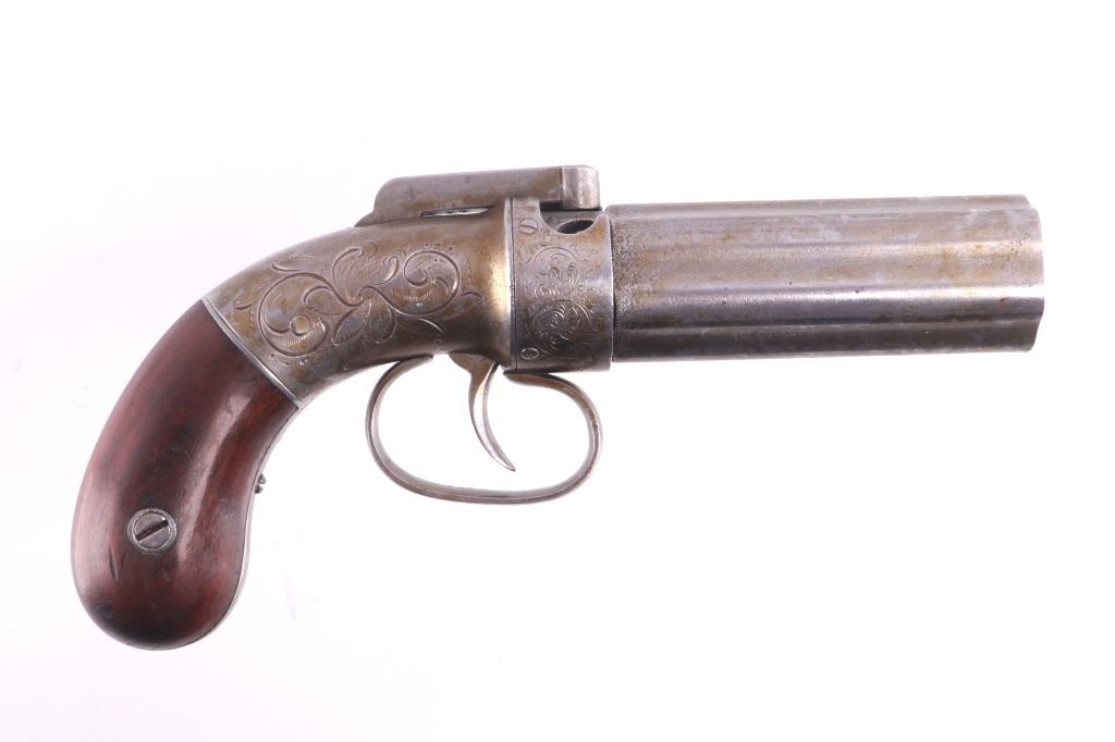 Included in this lot is a factory engraved Allen & Thurber six shot percussion “Pepperbox” revolving pistol, circa 1840’s, .32 caliber with 3 1/2" long early style ribbed barrels. This is the medium size Allen Pepperbox that found favor as a large pocket pistol and a holstered belt weapon. These early competitors to the Colt and Remington revolvers found favor with the “49ers” of California Gold Rush fame, western pioneers, and urban dwellers in need of a repeating firearm for self-defense. Many were carried as private weapons on both sides of the Civil War. Examples in fine condition are rare, as these handguns were often used for “daily carry” by their owners. This is a very fine example as it displays a lovely uncleaned patina and still retains traces of original brass finish on the barrels. The usual condition for one of these is heavily worn gray metal, at best, and, more often than not, badly rusted, pitted, and showing abuse. The frame is factory hand engraved, as are the nipple shield and back strap. This is a double action pistol, in which a single pull of the trigger revolves the barrel cluster, raises the bar-style hammer, and fires the gun. The bar hammer is marked “ALLENS PATENT”; it is also marked on a flute between the barrels “ALLEN THURBER”, “WORCESTER”, and "Patented 1837 Cast Steel". The walnut grips are excellent and exhibit much of the original finish. The pistol displays excellent mechanical condition and is a truly fine example of a uniquely American firearm from the pre-Civil War period. The pistol shows mechanical action with a heavy trigger pull. Serial Number: 447. This firearm qualifies as an Antique and does not require FFL Transfer or NICS Background Check.
