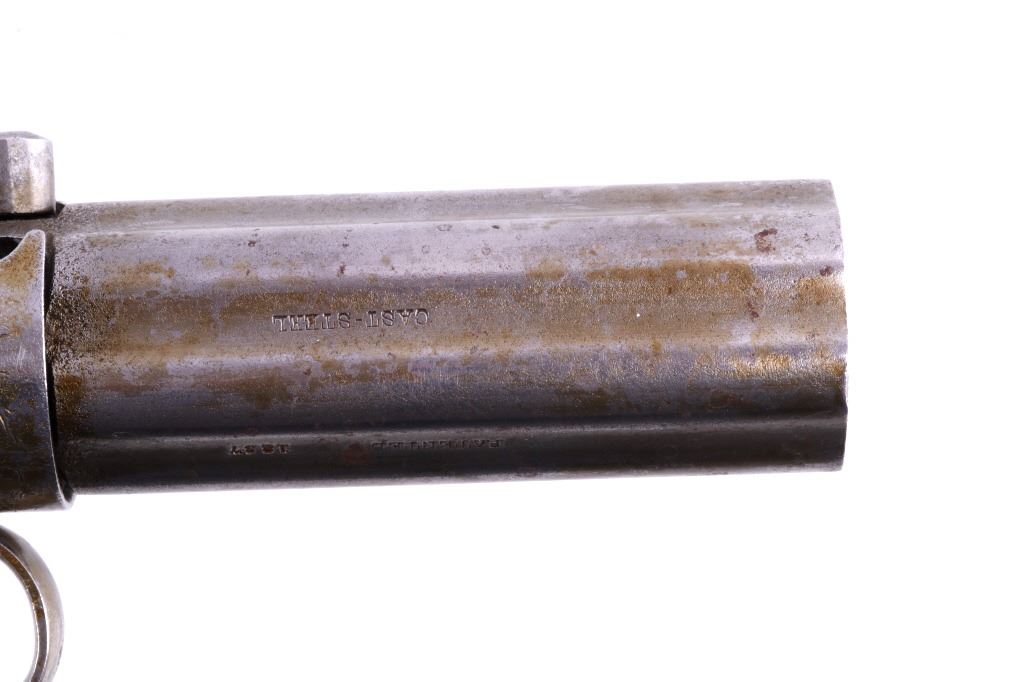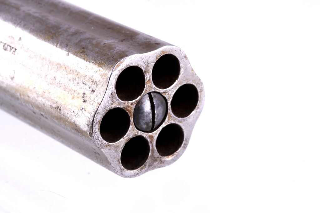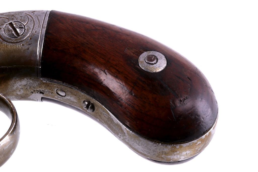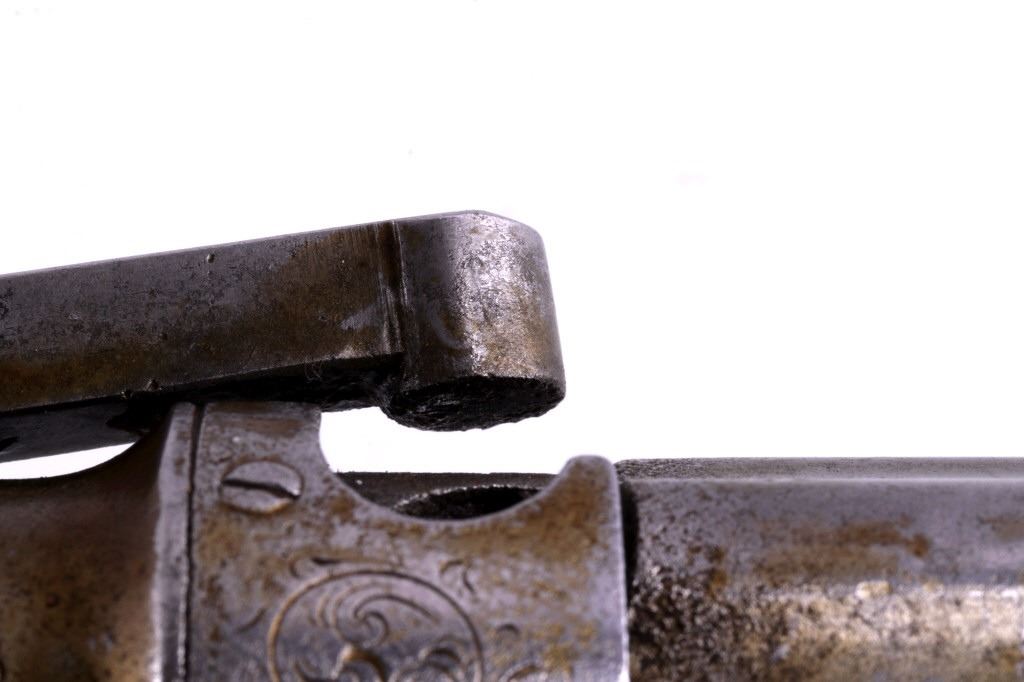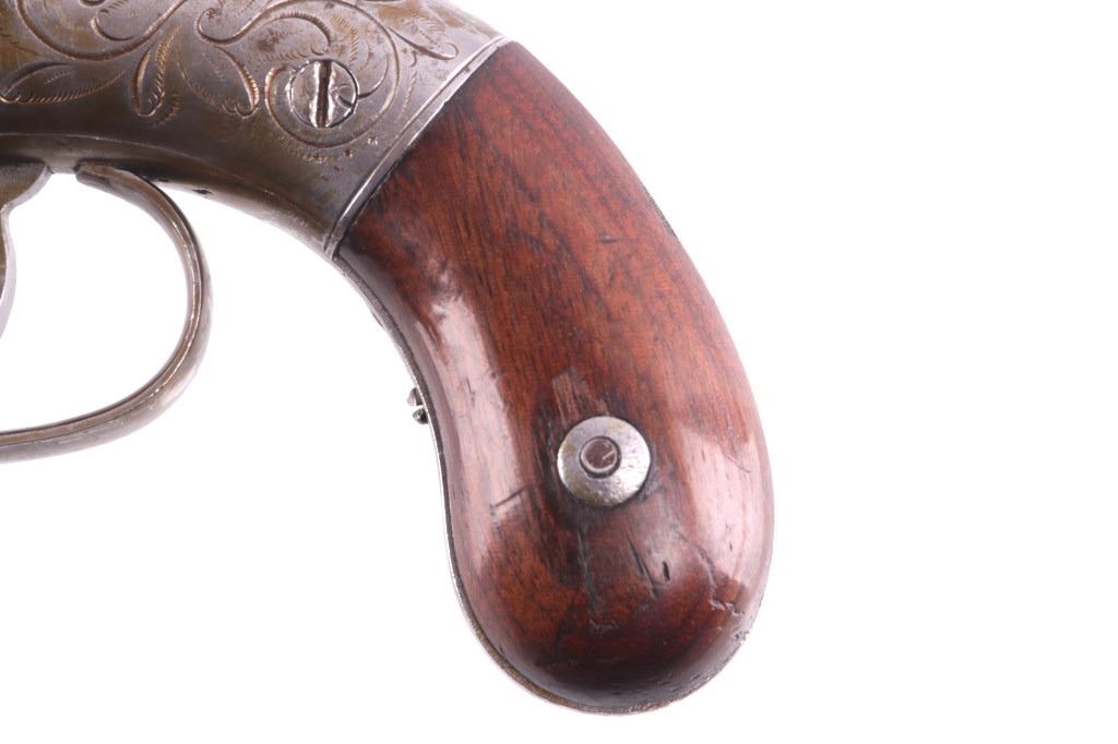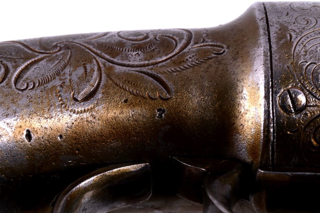 Included in this lot is a factory engraved Allen & Thurber six shot percussion “Pepperbox” revolving pistol, circa 1840’s, .32 caliber with 3 1/2" long early style ribbed barrels. This is the medium size Allen Pepperbox that found favor as a large pocket pistol and a holstered belt weapon. These early competitors to the Colt and Remington revolvers found favor with the “49ers” of California Gold Rush fame, western pioneers, and urban dwellers in need of a repeating firearm for self-defense. Many were carried as private weapons on both sides of the Civil War. Examples in fine condition are rare, as these handguns were often used for “daily carry” by their owners. This is a very fine example as it displays a lovely uncleaned patina and still retains traces of original brass finish on the barrels. The usual condition for one of these is heavily worn gray metal, at best, and, more often than not, badly rusted, pitted, and showing abuse. The frame is factory hand engraved, as are the nipple shield and back strap. This is a double action pistol, in which a single pull of the trigger revolves the barrel cluster, raises the bar-style hammer, and fires the gun. The bar hammer is marked “ALLENS PATENT”; it is also marked on a flute between the barrels “ALLEN THURBER”, “WORCESTER”, and "Patented 1837 Cast Steel". The walnut grips are excellent and exhibit much of the original finish. The pistol displays excellent mechanical condition and is a truly fine example of a uniquely American firearm from the pre-Civil War period. The pistol shows mechanical action with a heavy trigger pull. Serial Number: 447. This firearm qualifies as an Antique and does not require FFL Transfer or NICS Background Check.
