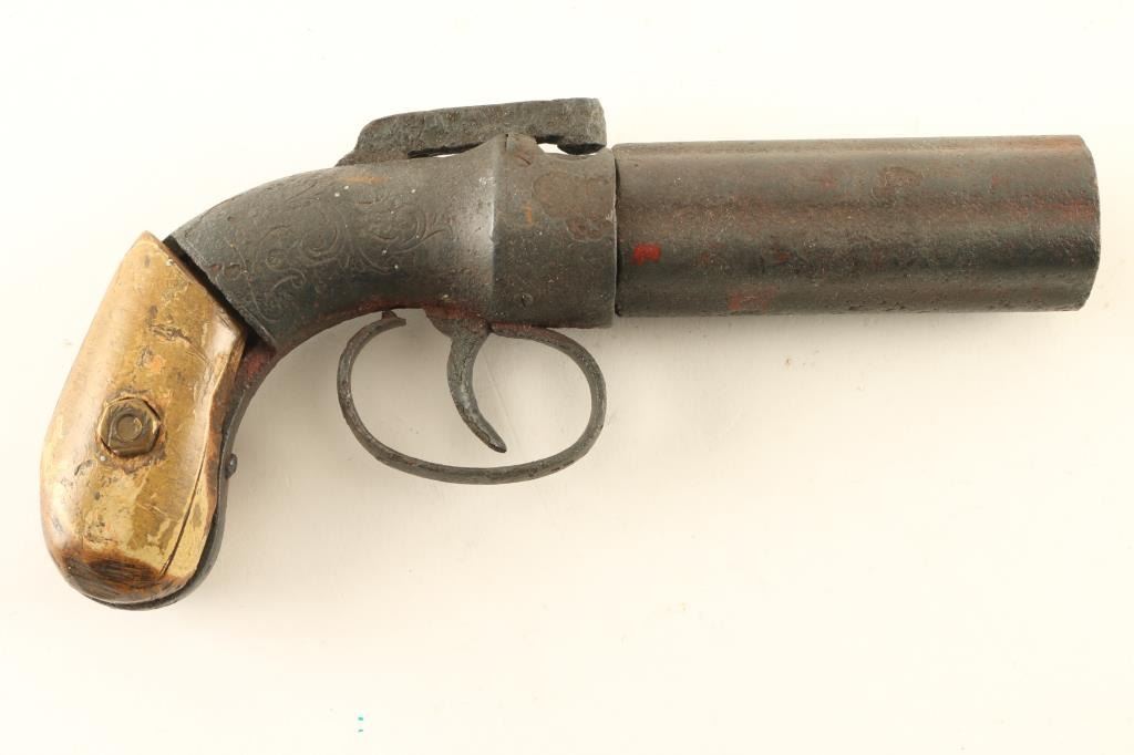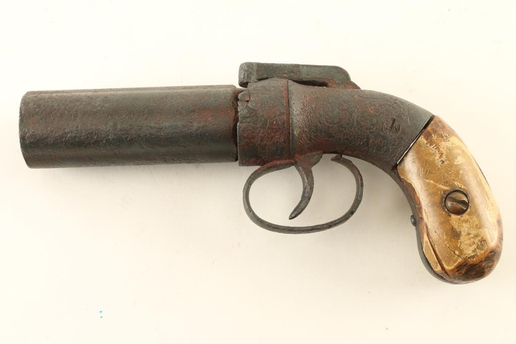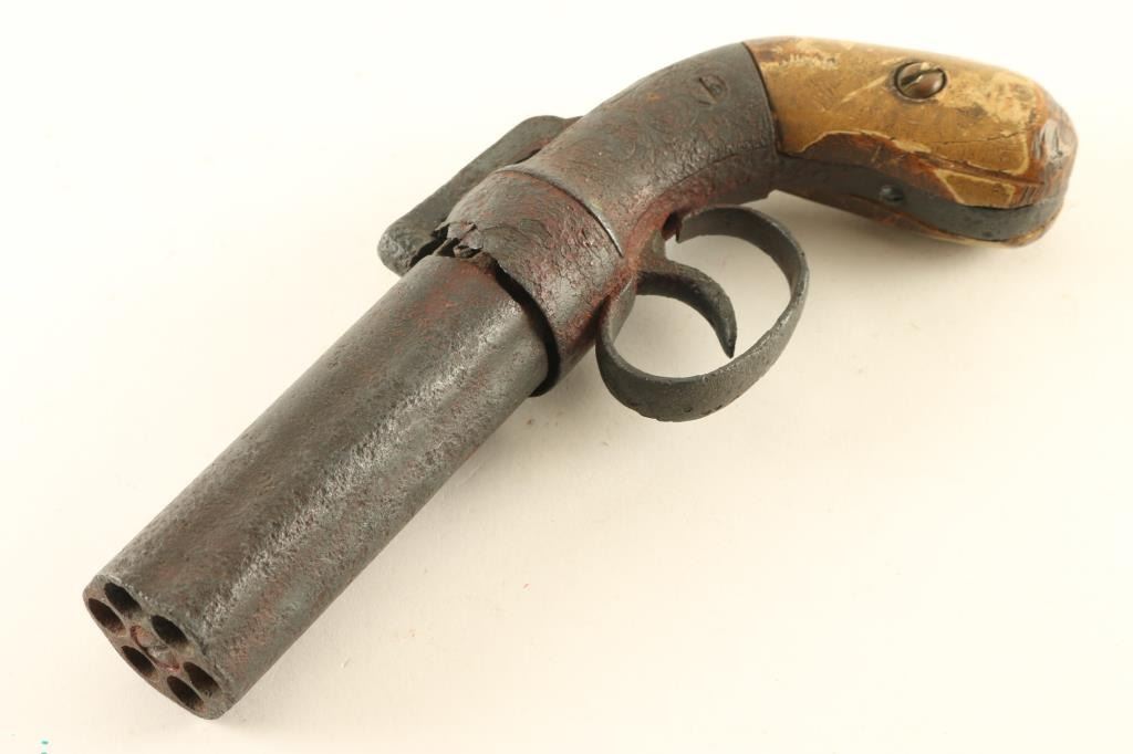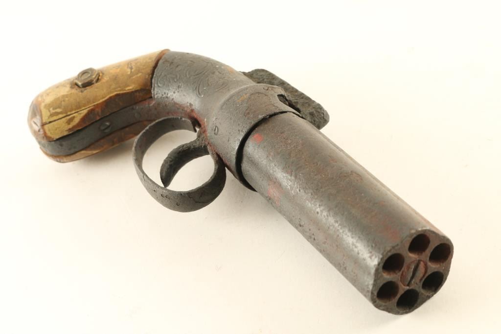 Relic condition pepperbox pistol features 3.5" barrel assembly with 6 barrels, top mounted hammer, non-operating action with trigger frozen in place. Surface finish is an even pitted brown with reddish colored rust or other corrosion in places. Hammer is loose and moves freely. Grips are poor condition with many cracks, replacement brass grip screw is secured by a large hex nut. Condition is NRA Poor - for Display Only *** Antique Firearm ***