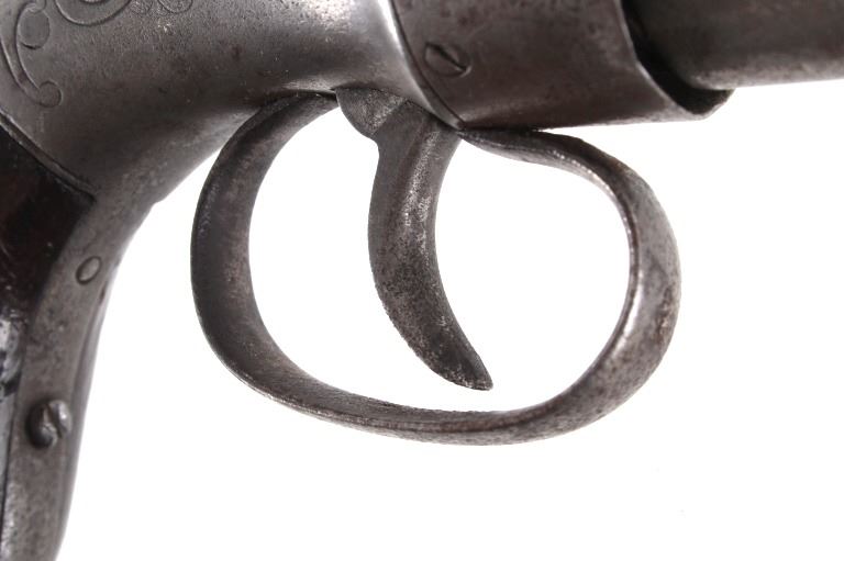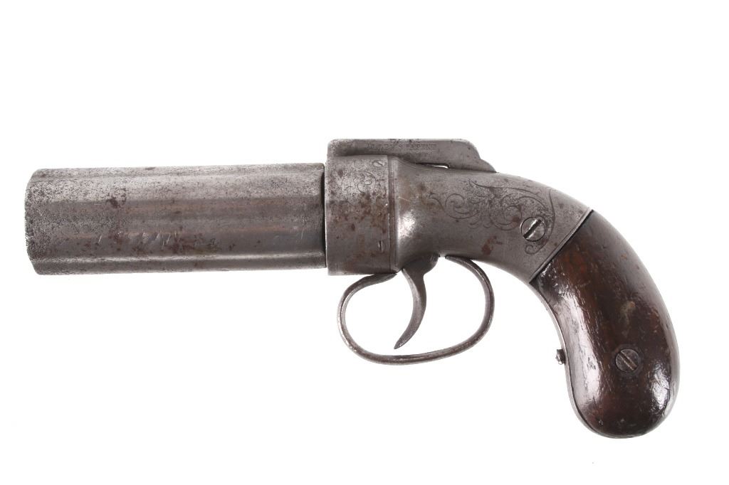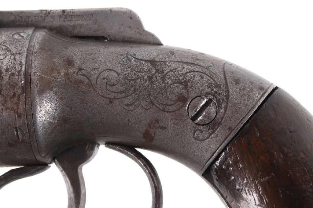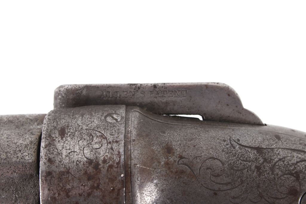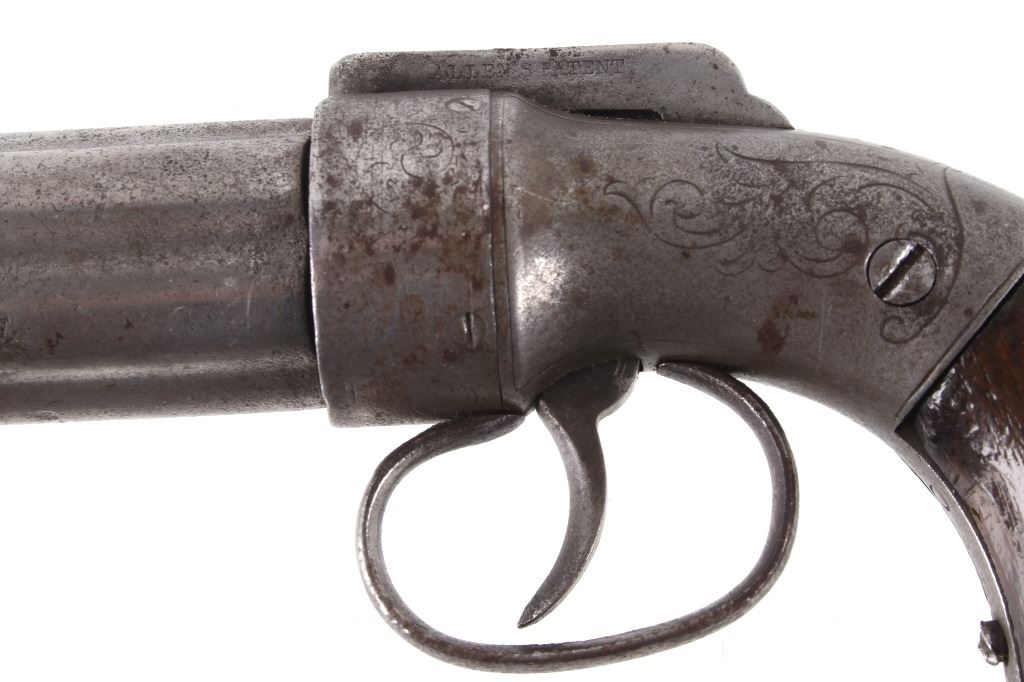 Allen & Thurber six shot double action bar hammer pepperbox, made 1840s-1850s.  The famed Allen’s patent pepperbox pistols came in many sizes from diminutive pocket models to massive “dragoon” holster pistols. During this time, the percussion revolvers from Colt were still new, innovative arms that were at times in limited availability, were expensive and somewhat fragile. Pepperbox pistols with multi-barrels were less expensive and simpler mechanically than revolvers.