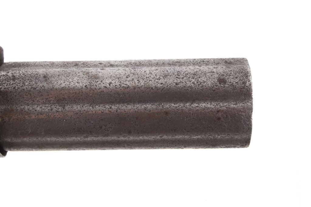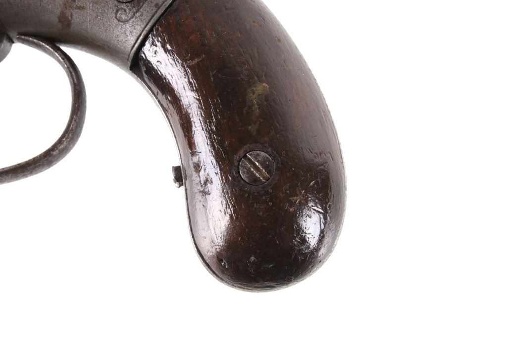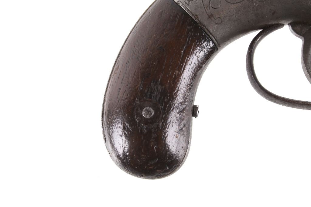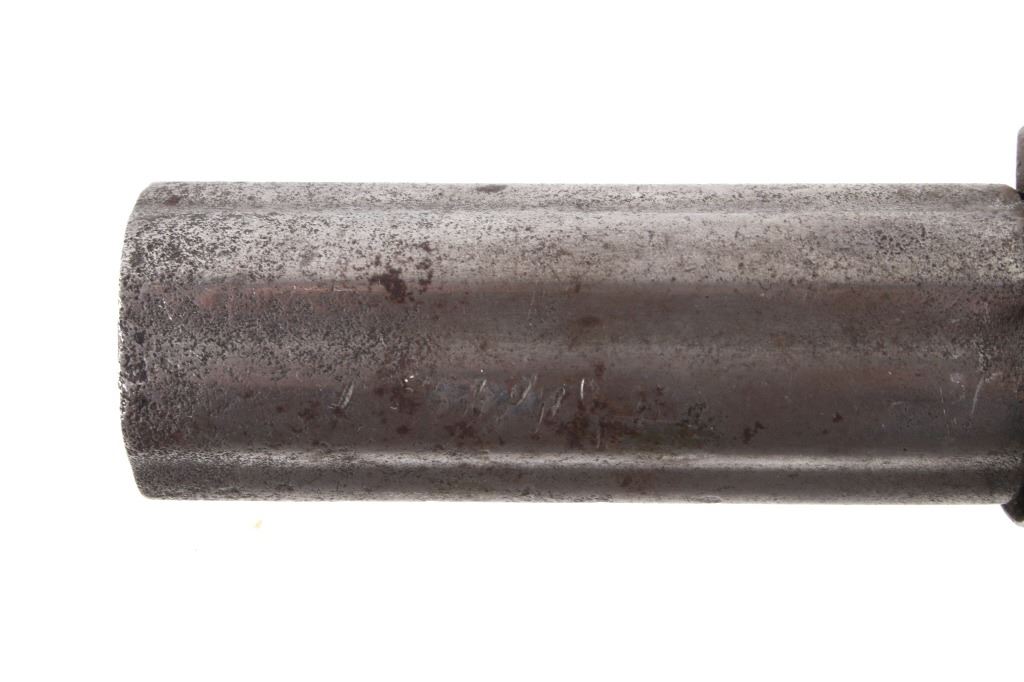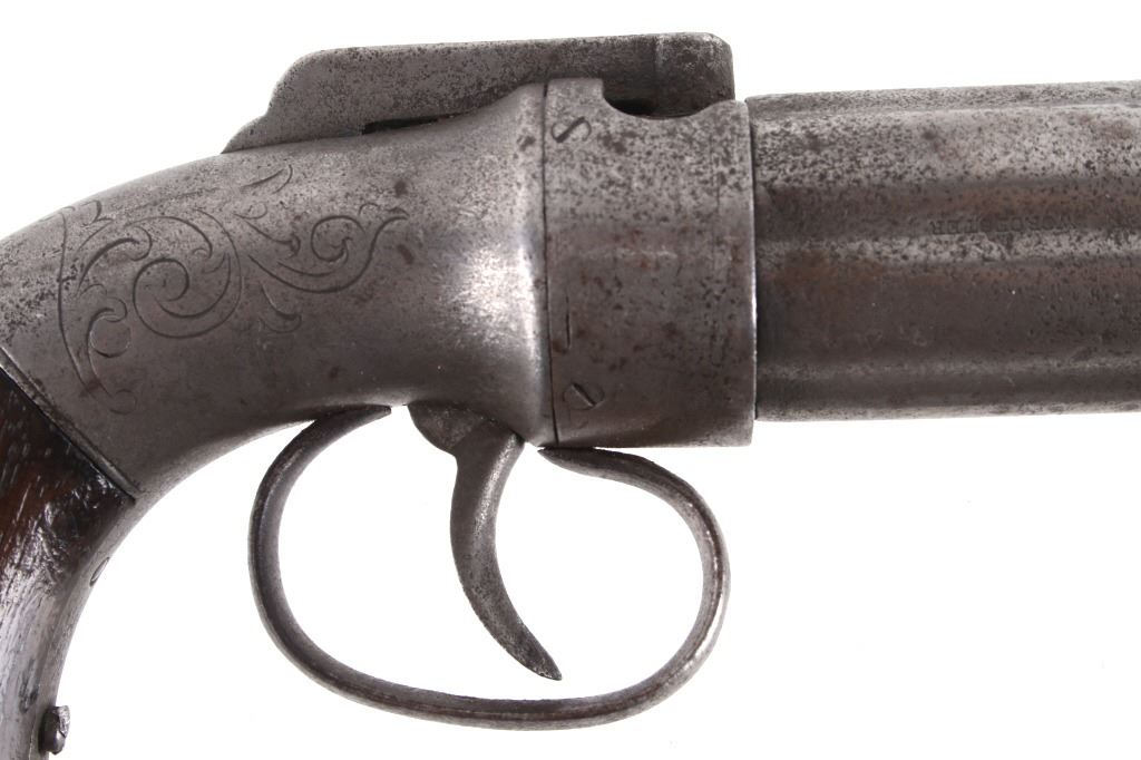Allen & Thurber six shot double action bar hammer pepperbox, made 1840s-1850s.  The famed Allen’s patent pepperbox pistols came in many sizes from diminutive pocket models to massive “dragoon” holster pistols. During this time, the percussion revolvers from Colt were still new, innovative arms that were at times in limited availability, were expensive and somewhat fragile. Pepperbox pistols with multi-barrels were less expensive and simpler mechanically than revolvers.