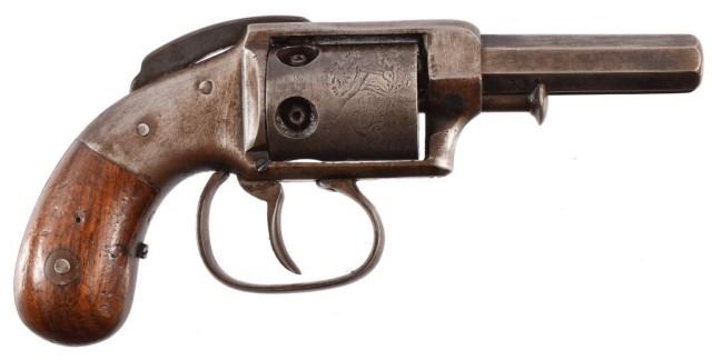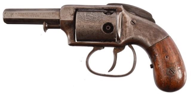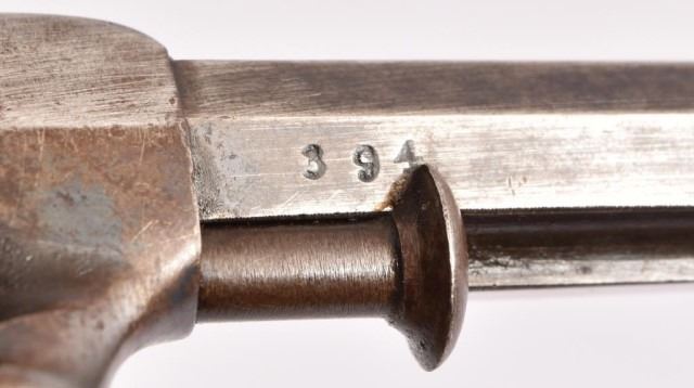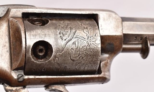 Allen & Wheelock Bar hammer 5 shot D.A. pistol. Engraved cylinder scene, .28 cal. Serial no. 394