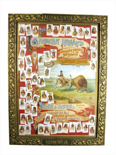 Allen and Ginter Tobacco Company Paper Sign, Richmond, VA. Showing authentic portraits of 50 celebrated Indian Chiefs. Extremely Rare. Excellent original condition in original frame. 24 1/2 X 33 1/2 inches.