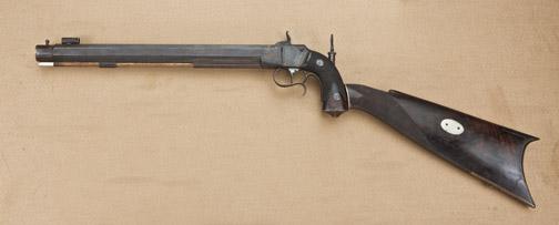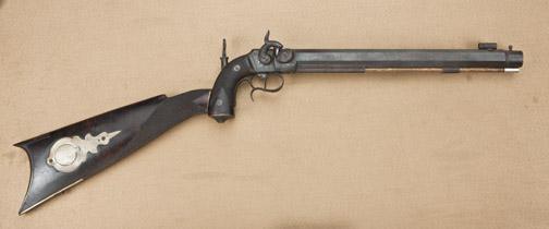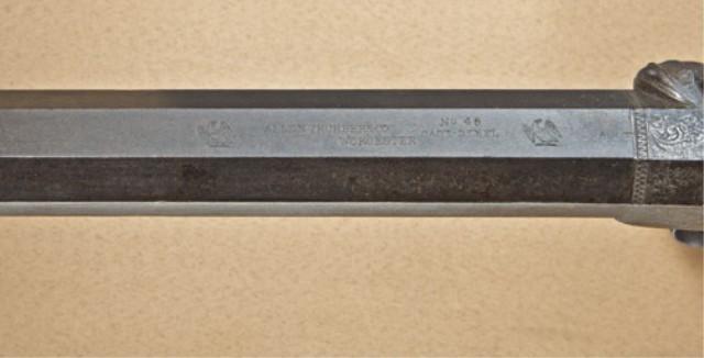 Allen and Thurber .36 caliber percussion target pistol with removable shoulder stock. Approx. 13” heavy octagon barrel, deluxe checkered wood grip and should stock. Fancy silvered and hand-engraved patchbox, adjustable set trigger, tang mounted peep sight, marked Allen and Thurber & Co, Worchester. #45. Cast steel, with American eagle stamp front and rear of barrel address. Refer Flayderman 5A-010. The pistol remains in good original condition showing an even patina finish , some scattered light to moderate erosion and pinprick pitting, slightly heavier pitting at the breech area from firing. The metal surfaces as re generally good. The stock and grip are in matching condition, some darkening and oil staining. There is a grip cap screw missing. The patchbox is very nicely engraved with scrolls and flowers and the portrait of a reclining leopard. The buttplate shows some dark patina and some erosion. A metal tipped old ramrod is included. The pistol shows original tang peep sight and a false muzzle that is removable. In the words of Norm Flayderman, “Scarce and Prized specimen for the Allen collector” and also for the New England firearms collector. Est: $1,500 - $3,000