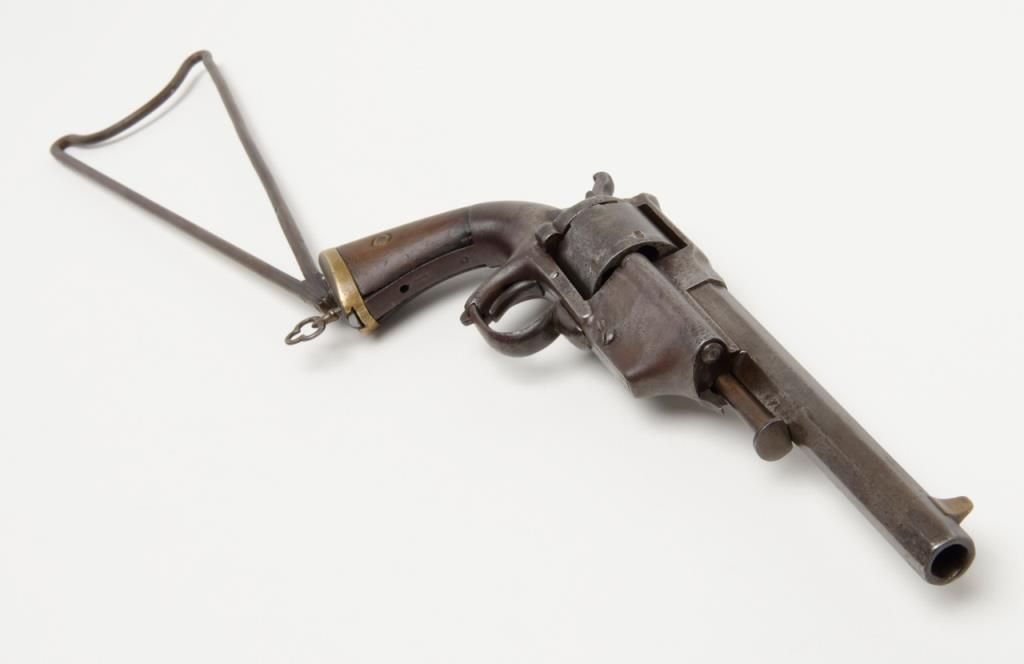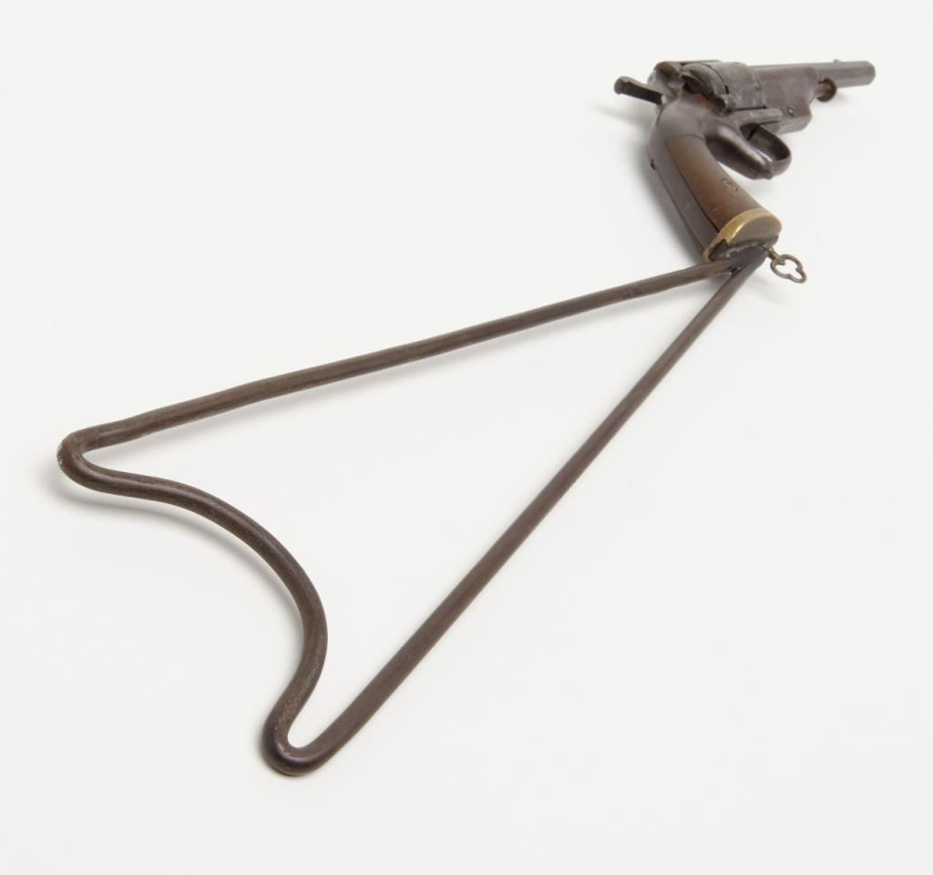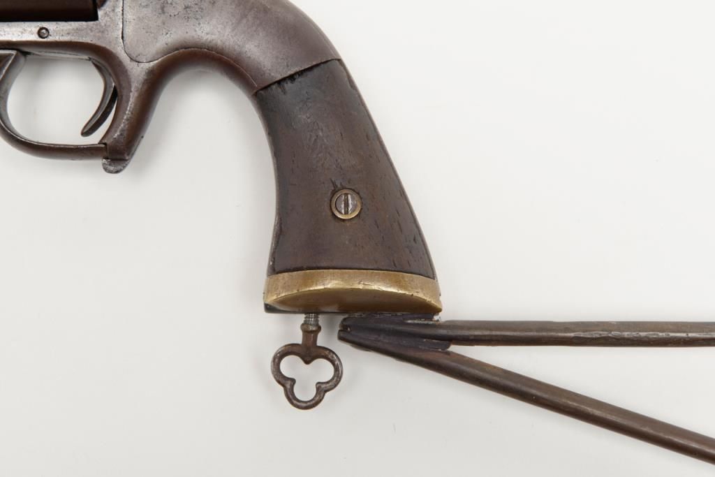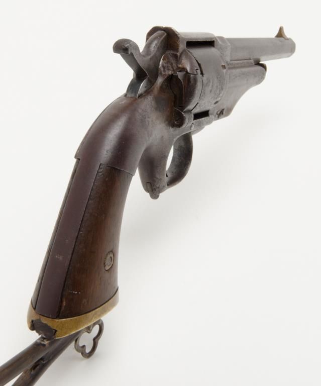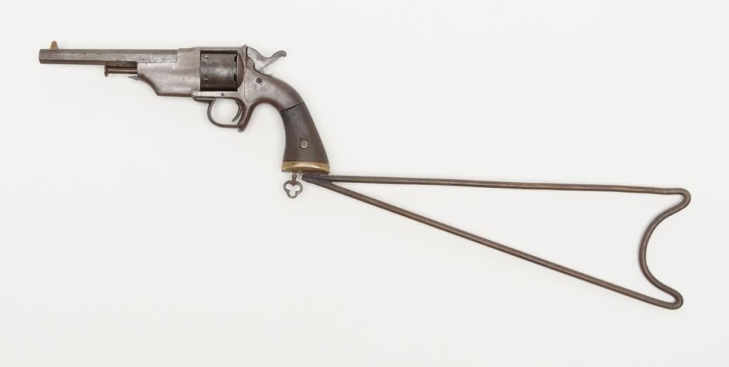 Allen and Wheellock Civil War era .38 caliber rimfire single action revolver with period handmade detachable shoulder stock. This pistol remains in fair to good condition showing a brown patina finish with scattered light to moderateerosion and pinprick pitting. The action works well and no markings are visible. The grips show some small losses and cracks along with minor imperfections. There is a brass cap that is grooved to accept the iron frame removableshoulder stock which is definitely genuine to the period of use. Est.: $1000-$2000