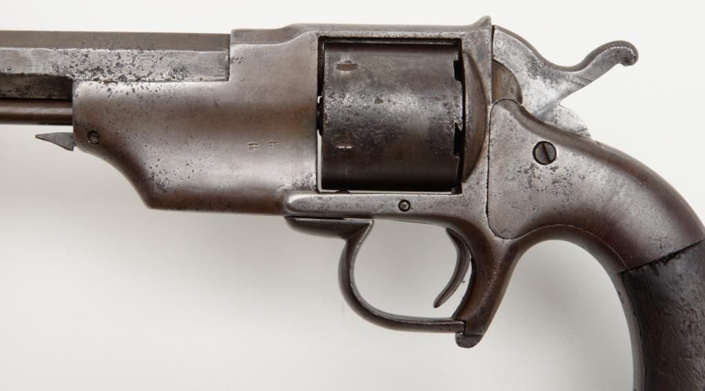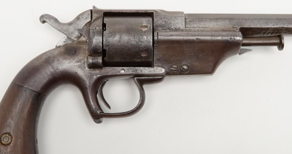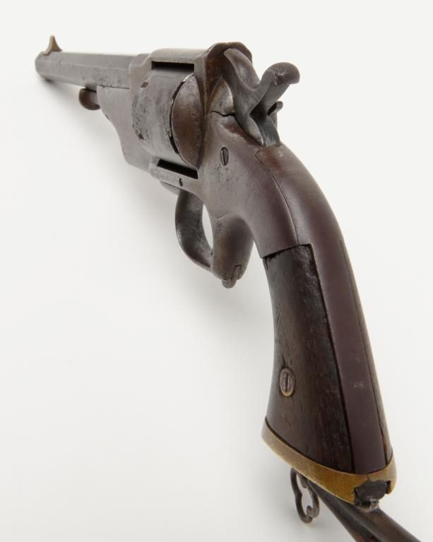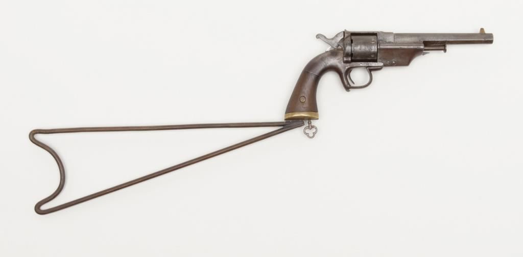 Allen and Wheellock Civil War era .38 caliber rimfire single action revolver with period handmade detachable shoulder stock. This pistol remains in fair to good condition showing a brown patina finish with scattered light to moderateerosion and pinprick pitting. The action works well and no markings are visible. The grips show some small losses and cracks along with minor imperfections. There is a brass cap that is grooved to accept the iron frame removableshoulder stock which is definitely genuine to the period of use. Est.: $900-$1800