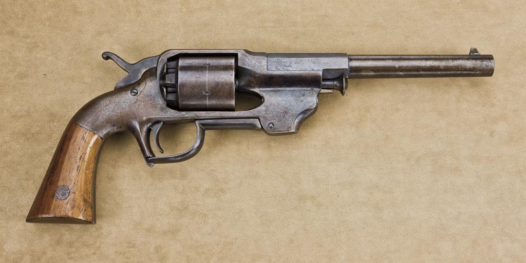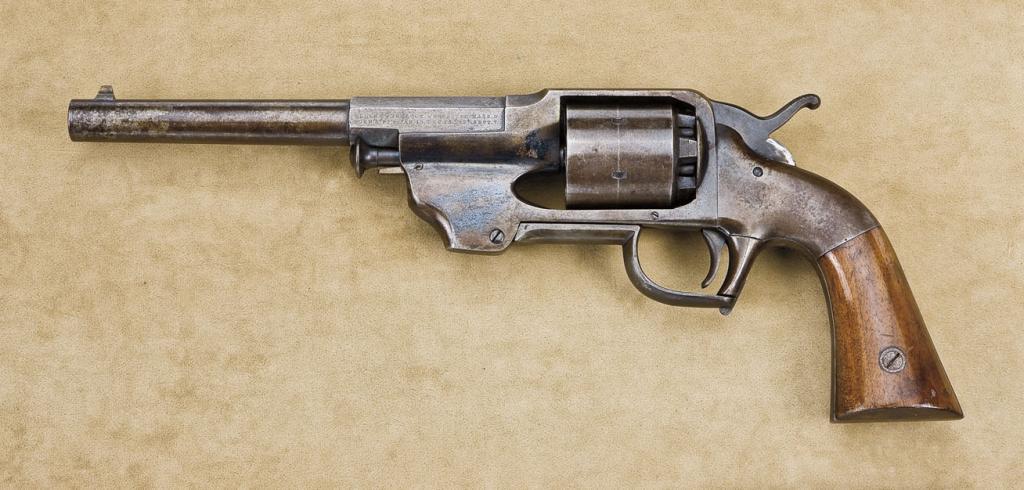 Allen and Wheelock Center Hammer Army percussion revolver, .44 cal., 7-1/2” barrel, blue finish, wood grips, #NVSN. This revolver is in overall very good condition showing approx. 10% original blue primarily in the protected areas with the balance of finish going to a pleasing brown patina with some scattered erosion areas on the front end of the barrel; very good bore, crisp action, good markings and grips with just a couple of dings and mars from carry and storage; considerable original finish left on the grips and an interesting period stamped “R” on the bottom of the left grip. Est.: $1,500-$3,000.