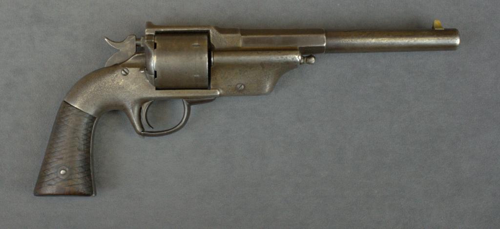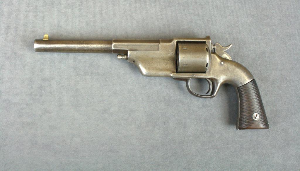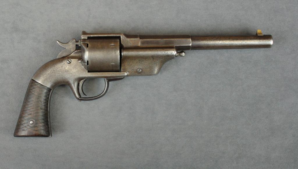 Allen and Wheelock Lipfire Army .44 caliber  revolver period converted to percussion,  7-1/2” half round/half octagon barrel, wood  grips, #172. This gun is in overall good to  very good as converted, even light brownpatina on metal surfaces with some scattered  spots of erosion and light pitting, very good  action, dark bore, visible markings, grips  are overall good showing period cross hatch  checkering; conversion is expertlyaccomplished and early style factory top  hinged loading gate remains; brass front  sight. Only approx. 250 of this Allen and  Wheelock were manufactured in the early  1860’s and this is the only period conversion we have cataloged for public auction.  Est.:   $1,500-$3,000.