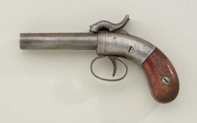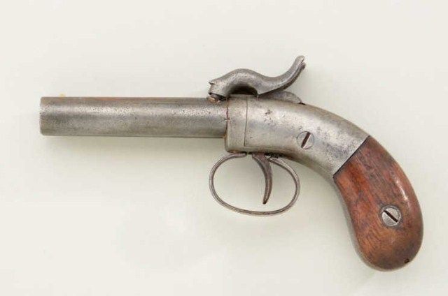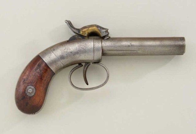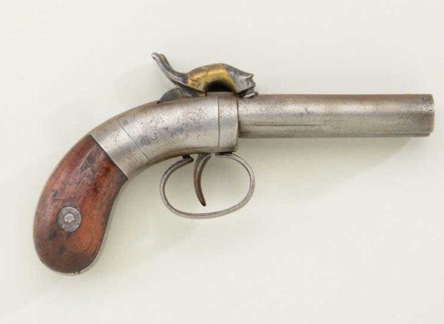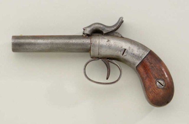 Allen double barrel percussion pocket pistol, circa 1830-1850’s. Serial #724 in good original condition. The pistol measures 6-1/2” overall with 3” barrels of approx 41 cal smooth bore. The metal surfaces show alight gray patina, the right hammer shows a brazed copper repair. The grips are good, small marks, normal aging and some small losses. Action works but does not stay cocked. A favorite during the old west andgold rush era. From an old New York collector’s estate. Est.;$200-$400.