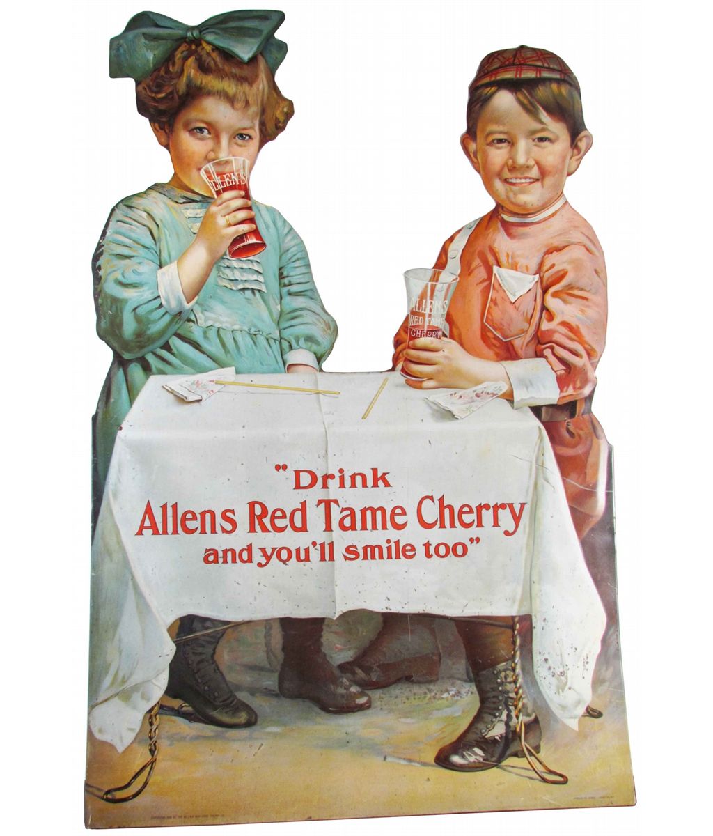 Allen's Red Tame Cherry Co. Die Cut Embossed Tin Sign with metal easel back. Copyright 1910. American Art Works, Coshocton, Ohio. Comes with history of Artist and subjects on back. Some minor paint loss otherwise good condition. 23 1/2 X 35 1/4 inches.