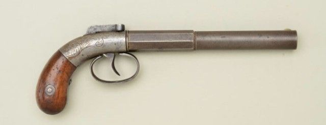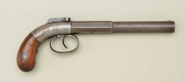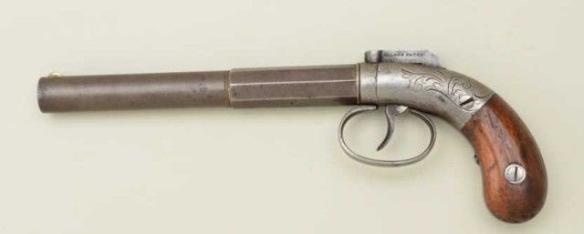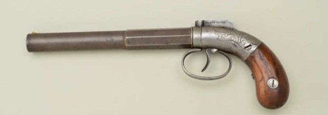 Allen’s patent bar hammer single-shot pistol, serial #190 with 6-1/8” half round half octagon barrel of 32 cal rifled. The metal is in good condition with traces of finish, some scattered light pitting with very goodgrips showing just normal age and minor imperfections. From an old N.Y. collector’s estate. Est.;$250-$500.