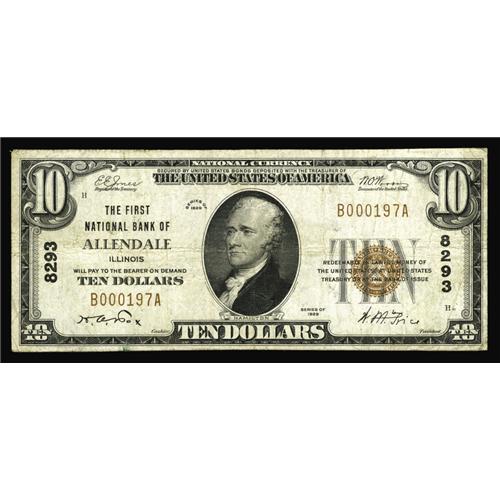 <B>Allendale, IL</B></I> - $10 1929 Ty. 1 <B>The First NB</B></I> Ch. # 8293<BR>This is one of 13 small in the census from this Wabash County bank that was managed by H.A. Fox and W.M. Price. <B>Fine-Very Fine.</B></I>