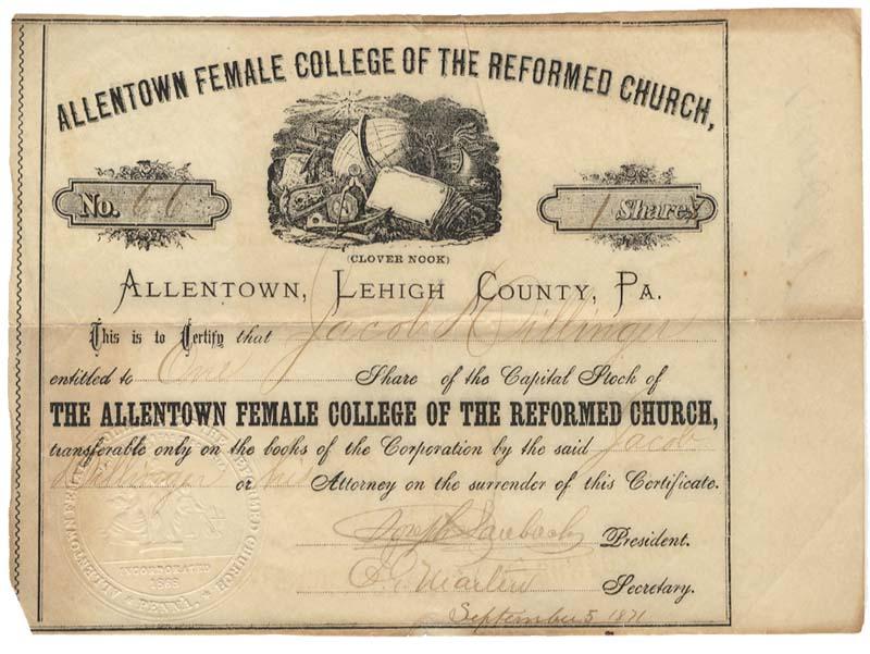 1871, Allentown, Pennsylvania. Stock certificate for 1 share. Black. Vignette of a Globe, compass, book and other implements. Litho. Today, the college is known as Cedar Crest College and has been rated by Forbes Magazine to be one of the top ten liberal arts colleges for women in the United States. A brief history taken from a recent publication of Cedar Crest College: From Clover Nook to Cedar Crest On September 5, 1867, nine young women gathered in a classroom located in the basement of Zion Reformed Church in Allentown, Pennsylvania. They were the first students of the recently established Allentown Female College. Within days, classes moved to the second floor of a building on Hamilton Street. In 1869 the institution again moved, this time to a two-acre campus at the intersection of Fourth and Turner Streets. The College owned only one structure, which served as a classroom building and dormitory. Founded by the Reformed Church, Allentown Female College promised a collegiate education in a Christian environment. Some students sought a three-year program that stressed the liberal arts; others trained to become school teachers; and still others desired only a finishing school education. In 1893 the institution changed its name to Allentown College for Women. But most students affectionately referred to their little campus by its nickname, “Clover Nook.” A scarce and early certificate from this long-lived women’s college. Small loss of paper at lower left corner. Some light toning at upper margin. Fine.