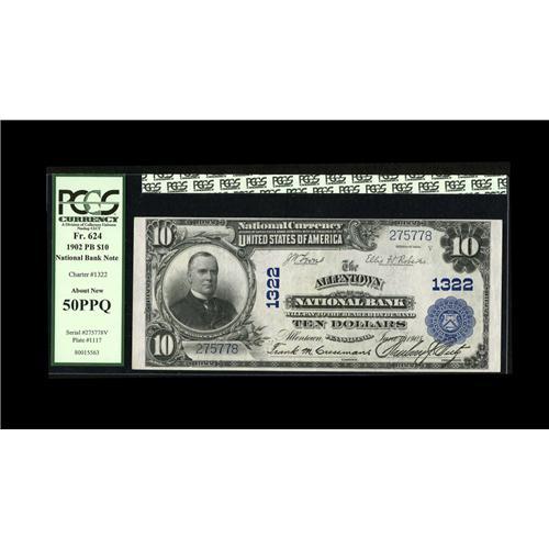<B>Allentown, PA</B></I> - $10 1902 Plain Back Fr. 624 <B>The Allentown NB</B></I> Ch. # 1322<BR>Printed officer signatures adorn this lightly handled note. <B>PCGS About New 50PPQ.</B></I><BR><BR><b>Shipping:</b> Coins & Currency (<a target="_blank" href="http://www.heritageauctions.com/common/shipping.php">view shipping information</a>)