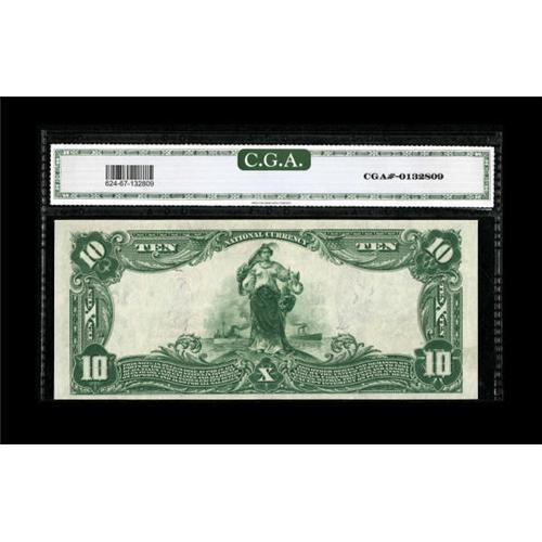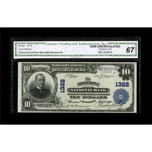<B>Allentown, PA</B></I> - $10 1902 Plain Back Fr. 624 <B>The Allentown NB</B></I> Ch. # 1322<BR> A nicely centered <B>CGA Gem Uncirculated 67 </B></I>example with bold color. After the Battle of Brandywine during the American Revolution the Liberty Bell was taken here and hidden in a church to keep it from falling into the hands of the Crown forces.<BR><BR><b>Shipping:</b> Coins & Currency (<a target="_blank" href="http://www.heritageauctions.com/common/shipping.php">view shipping information</a>)