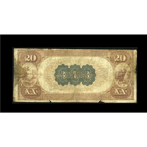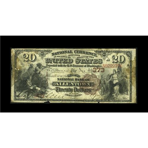 <B>Allentown, PA</B></I> - $20 1882 Brown Back Fr. 493 <B>The Second NB</B></I> Ch. # 373<BR>This note was recently discovered in a wall of an old farmhouse where it lay for many years until its recent discovery. The paper is technically <B>Fine</B></I> quality, but the staining, pinholes, and notches in the margin make for a net grade of <B>Very Good-Fine.</B></I> The signatures have survived well. This is the only $20 BB known from here.