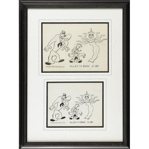 <B>"Alley to Bali" Model Sheet Animation Art (Walter Lantz Productions, 1954).</B></I> Sailors Woody and Buzz Buzzard vie for the attention of a South Pacific island girl, in the Lantz short, "Alley to Bali." Woody and Buzz admire a multi-limbed island beauty in this model sheet, which has an image area measuring 11" x 8". There is some light paper tanning; otherwise the condition is Very Good. Includes a smaller printed copy of the model sheet, which was distributed among the animators. Matted and framed. <BR><BR><B>Important notice:</B> Heritage usually auctions material at the rate of 200-250 lots per hour. On some occasions eBay Live bid software or the Internet may not be able to keep up with the pace of the auction. We recommend placing a realistic absentee bid now as insurance to avoid disappointment. Occasionally the auctioneer may eliminate or reject an eBay Live bid, and the auctioneer may also reopen a lot after the close of the eBay live bidding (usually because we missed an audience bid), and may reject your bid even if it shows you as the winning bidder. By bidding via eBay Live, you agree that Heritage may award the lot to another bidder at its sole discretion under the circumstances described above or any other reasonable circumstances. Since eBay bids are not shown to us until we open the lot on the floor, we treat those bids just like floor bids. In most cases the floor responds before the eBay bid is presented to us, due to Internet lag time, so for consistency we have made it a policy that floor bids are always considered first over tie eBay live bids. Also please note that all Heritage lots purchased through eBay Live carry a 22.5% Buyer's Premium. Please make sure you read the Terms and Conditions before you bid. This lot is being auctioned in conjunction with a live floor auction by Heritage Auction Galleries. All final auction and invoice information will be supplied by Heritage Auction Galleries, and all other information should be considered preliminary. Lot:41001 <BR><BR><B>Winning Notification and Billing:</B> After the FINAL session in this auction is complete, Heritage will send e-mail and snail mail invoices. This process normally takes several days. All final auction and invoice information will be supplied by Heritage Auction Galleries, and all other information should be considered preliminary. <BR><BR>This auction will be conducted on a live auction floor and over the Internet through eBay Live. If you choose to place an absentee bid, please take a moment to <font color='#0000ff'><u><a href='http://pages.ebay.com/liveauctions/help/before/laabsentee.html'>learn how eBay Live absentee bidding works</a></u></font><font color='#000000'>