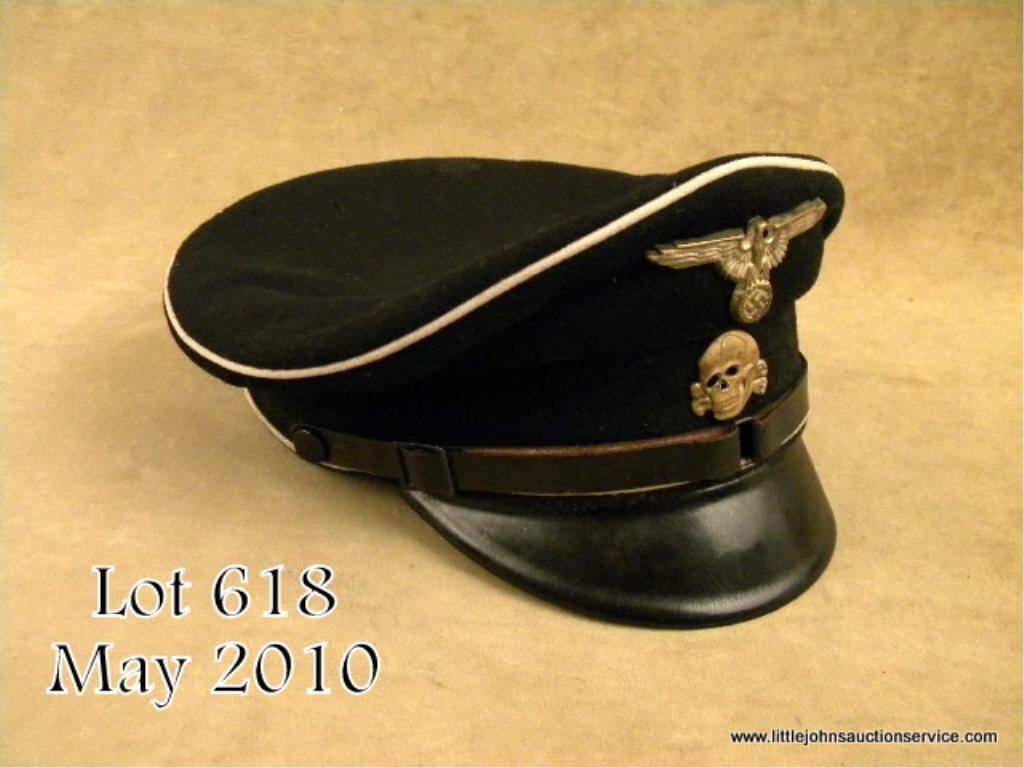 Allgemeine SS service visor cap complete with SS eagle and death’s head cap badges, chin strap, and SS markings on the inside. With inspection tag. Shows moderate period wear. Very good condition. Est: $1,500 - $3,000