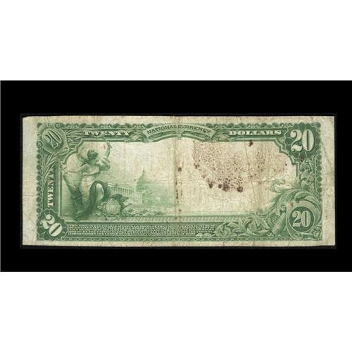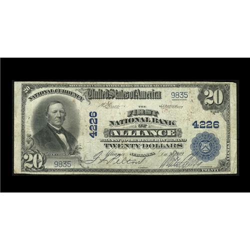 <B>Alliance, NE</B></I> - $20 1902 Plain Back Fr. 653 <B>The First NB</B></I> Ch. # 4226<BR>This institution was the most prolific issuer in Alliance, yet at close less than 1% of its issue was still outstanding. This piece retains the Cashier and President's signatures and the mottled soil noted is almost entirely reserved to the back of the note. <B>Fine-Very Fine.</B></I>