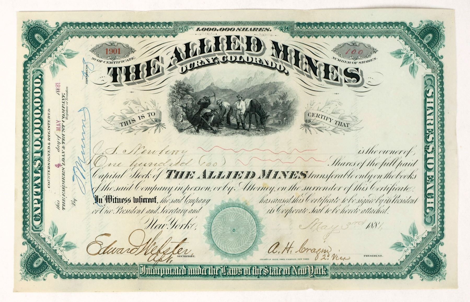 Ouray, Colorado" printed beneath title. Inc. in New York. No. 1901, issued for 100 shares to JS Newberry on May 3rd, 1881. Signed by the 2nd vice-president and asst. secretary. Not cancelled. Green border, black print, and vignette of prospectors and horse. Printed by ABN. Folds, two pinholes, very clean. 7.25 x 11.5" Company properties located in the Imogene Basin, Sneffels District, Ouray, Colorado. Five mines, 70 acres total, located 7 miles from Ouray, plus two mill sites. Mines include the Gertrude, Norma, Hidden Treasure, and Talisman. () Ken Prag Collection