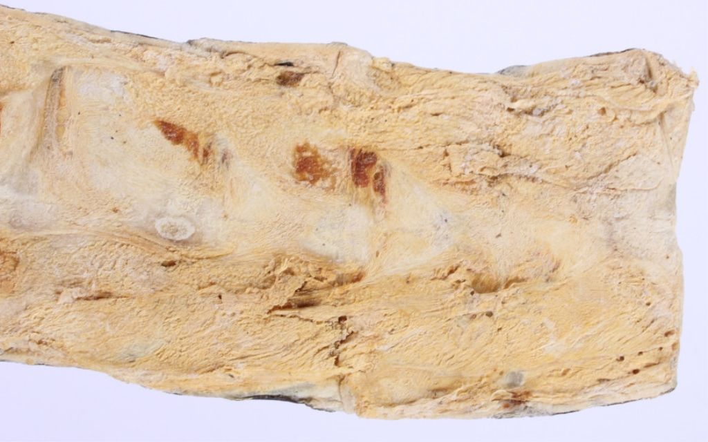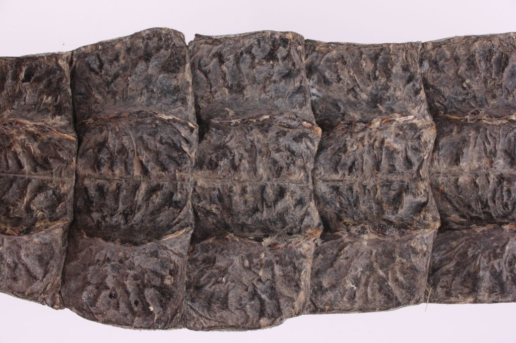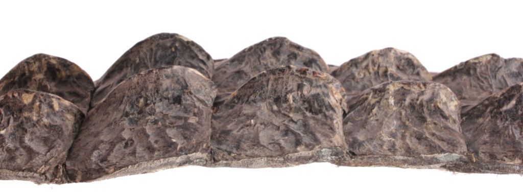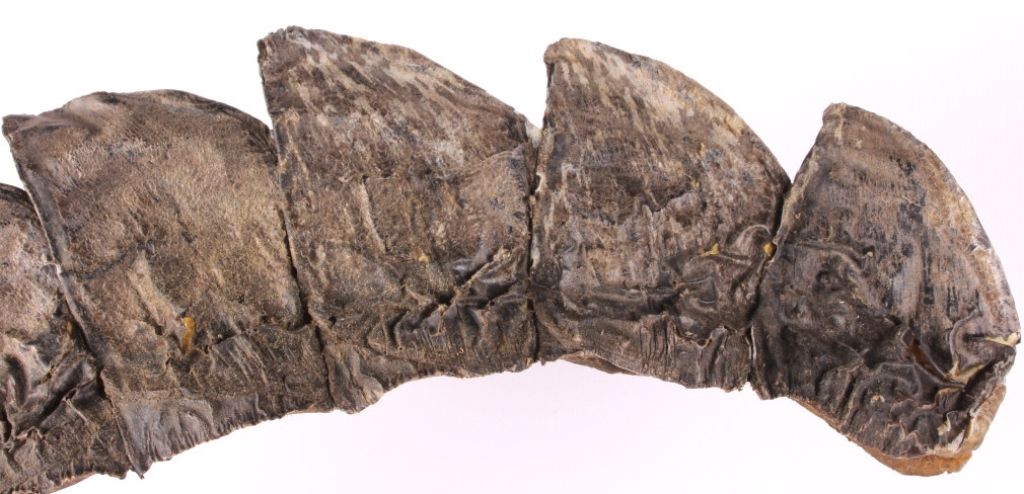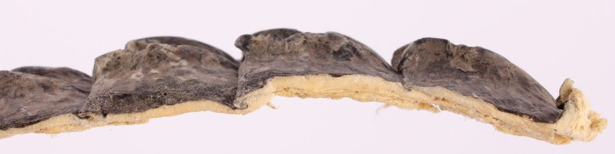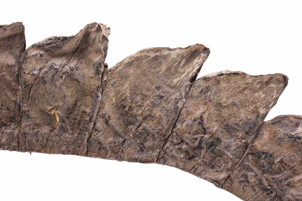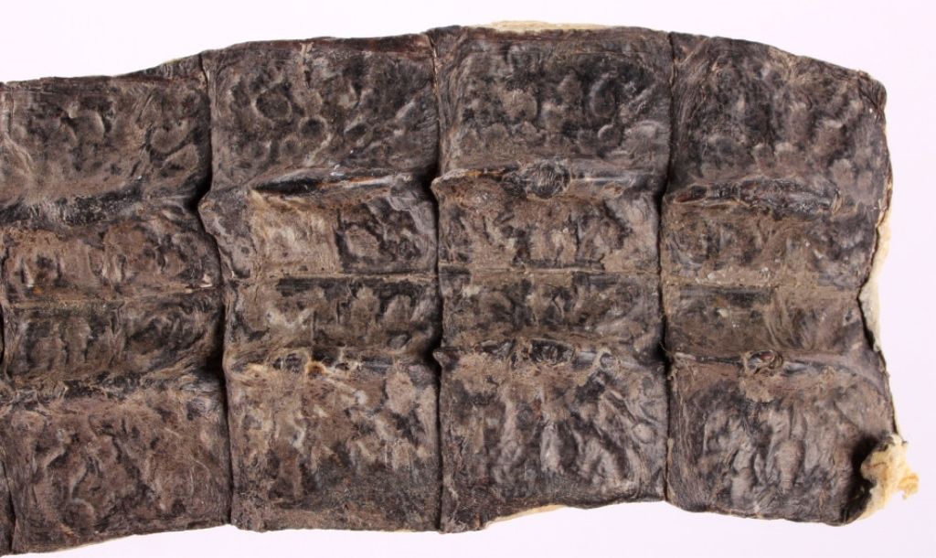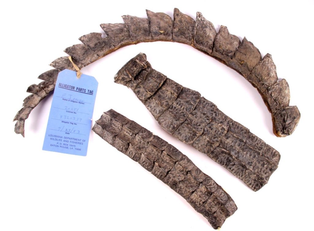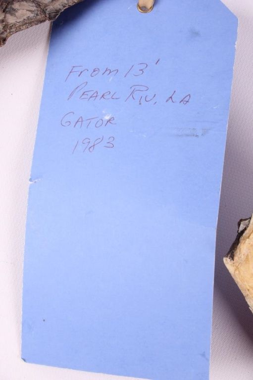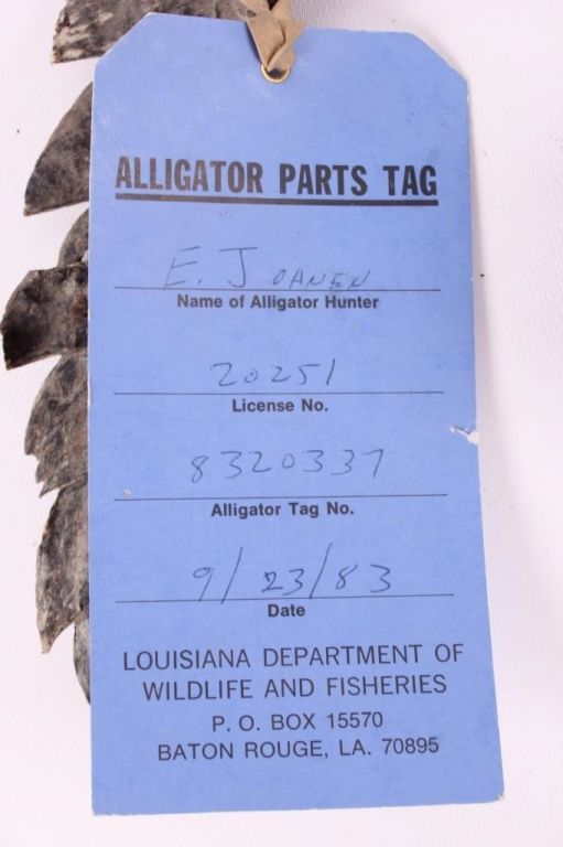 The lot features three Alligator spine pieces. The largest measures 22"x10.5" (with the oriignal Louisiana Department of Wildlife and Fisheries Tag that reads, E. Joanen Alligator Hunter 1983. The other two measure3.75"x14" and 2.5"x12".