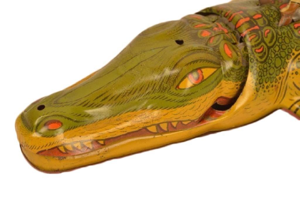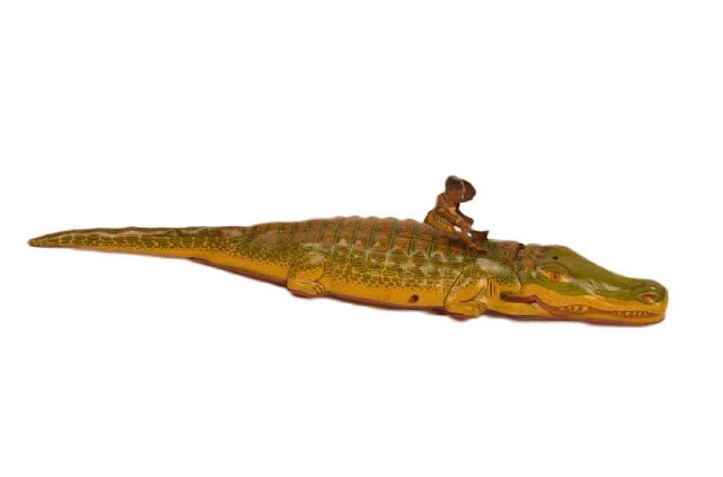 Alligator tin litho wind-up toy w/ rider. Wind-up mechanism does not work properly.