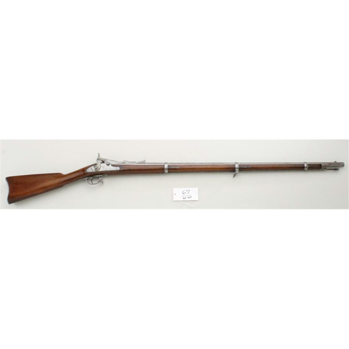 Allin Conversion of Civil War Springfield to .50-70 caliber, lock dated 1865. Good condition showing a grey patina finish, light to moderate scattered erosion and pinprick pitting. Good lock markings, stock showsbreak and repair in wrist and light refinishing. The action is good, bore very good. Est: $600 - $1,200