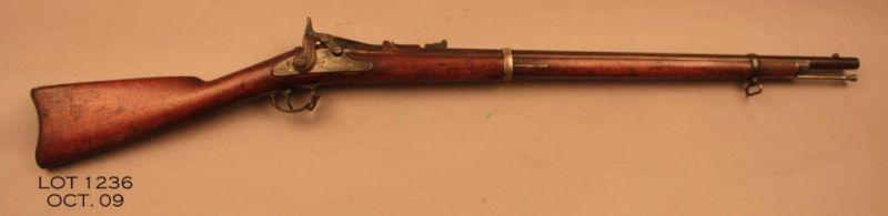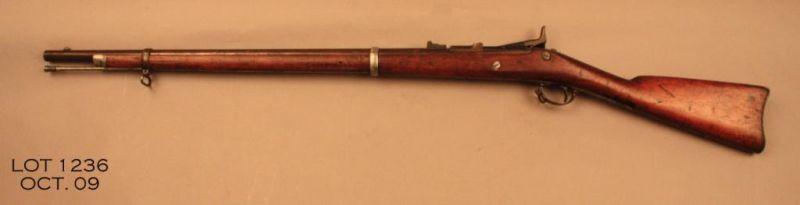 Allin conversion of a US Springfield rifle, .50 cal., 29” barrel, lock marked “S.N. & W.T.C. For Massachusetts”, in overall good condition showing a dark brown patina on barrel, light patina on lock plate, good action, fair to good bore,trapdoor dated 1866 with eagle head; wood stock is in overall good condition; ramrod and sling swivels present. Est.: $300-$600.