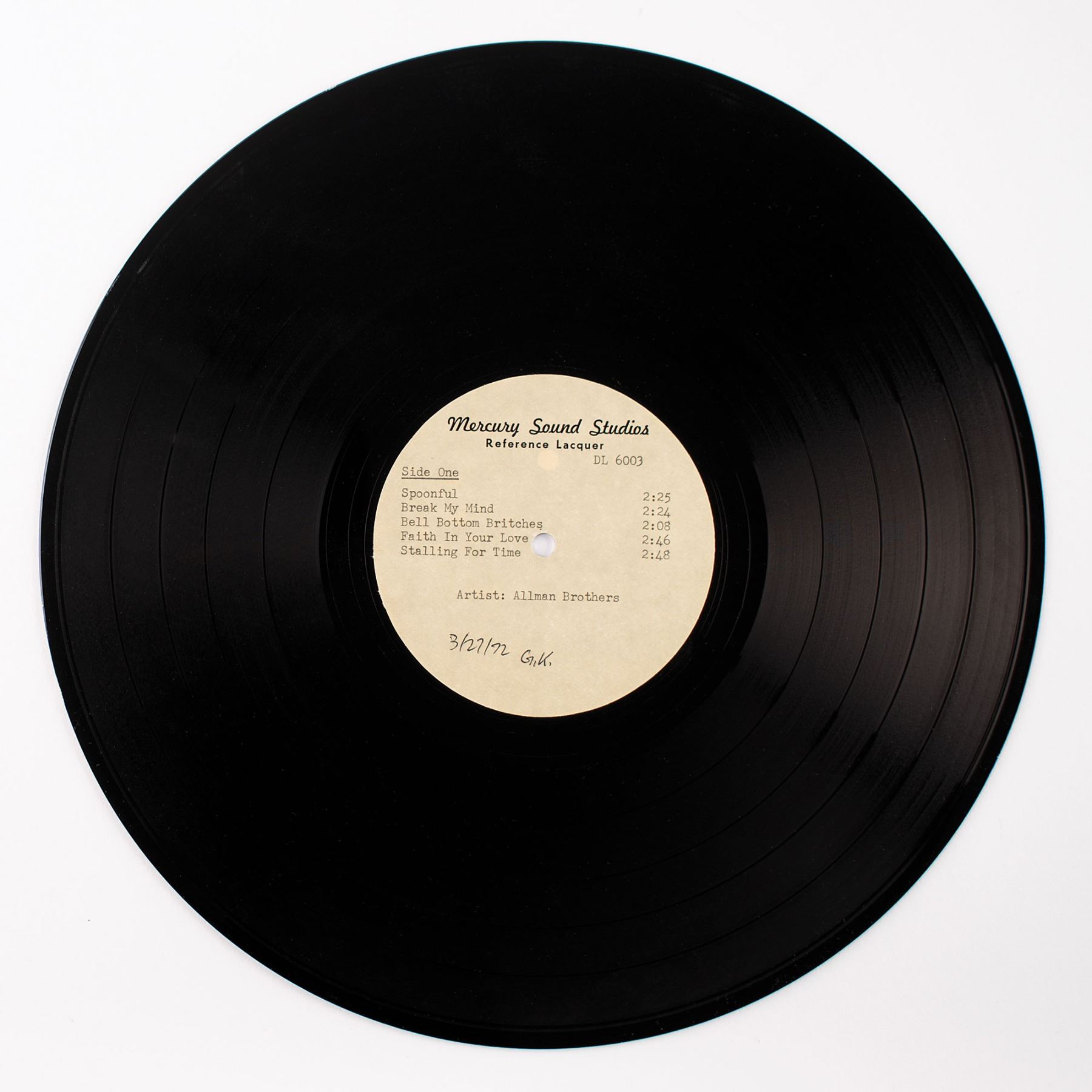 Double-sided 12˝ Mercury acetate for Early Allman by the Allman Joys—a band fronted by Duane and Gregg Allman—with "Mercury Sound Studios / Reference Lacquer" labels on both sides, filled out in type with the track listings: "Spoonful, Break My Mind, Bell Bottom Britches, Faith In Your Love, Stalling For Time, Gotta Get Away, Oh John, Street Singer, You'll Learn Someday, Ole Man River." Includes a generic sleeve and copies of the Mercury Records production report. Condition (Cover/LP Record): EX/NM-.