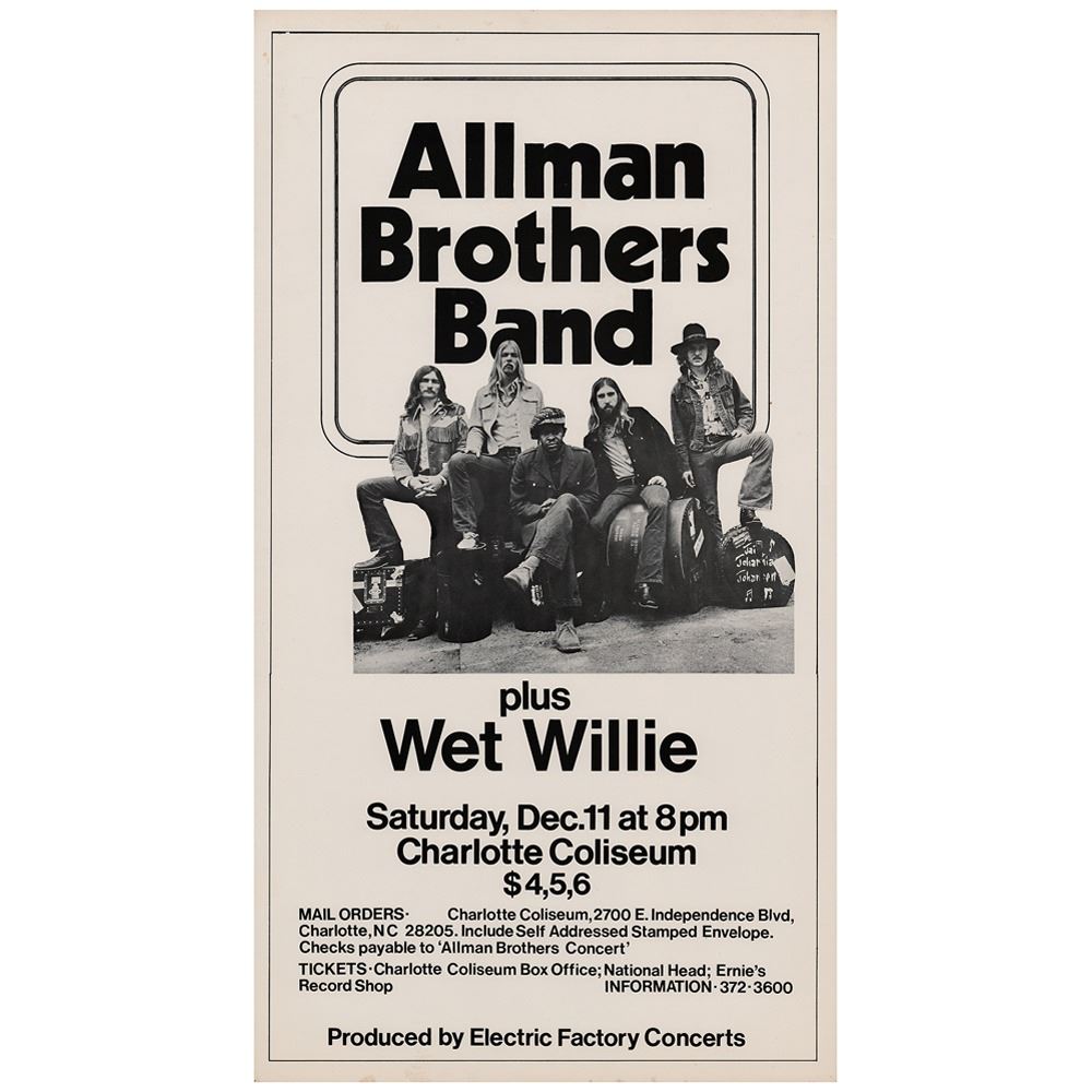 Original black-and-white 13 x 24 concert poster for the Allman Brothers Band plus Wet Willie at the Charlotte Coliseum in North Carolina on December 11, 1971, presented by Electric Factory Concerts. The poster features a classic image of the band by legendary rock photographer Jim Marshall. In fine condition.