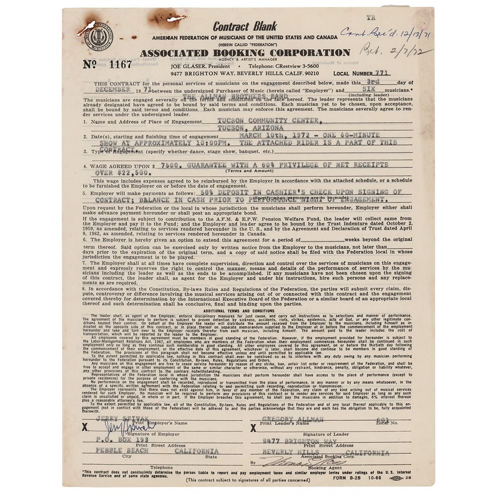 Concert contract for the Allman Brothers Band, one page, 8.5 x 11, December 3, 1971. Associated Booking Corporation contract blank engaging the Allman Brothers Band for a show at the Tucson Community Center in Arizona on March 10, 1972, for a "$7500 guarantee with a 60% privilege of net receipts over $22,500." Signed at the conclusion in ink by concert promoter Jerry Spivak and booking agent Thomas E. Ross. An attached six-page rider, also signed by Spivak and Ross, outlines the band's needs, including: "Eight (8) Altec A-7 speakers or equivalent…Fifteen (15) microphones, Shure SM56, SM58, SM53, or equivalent…A late model limousine capable of transporting seven (7) men…A current year model Hammond B-3 organ…and that there shall be no segregated facilities based on race, color or creed." In fine condition, with rusty staples to the upper left corner.