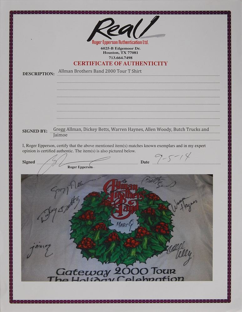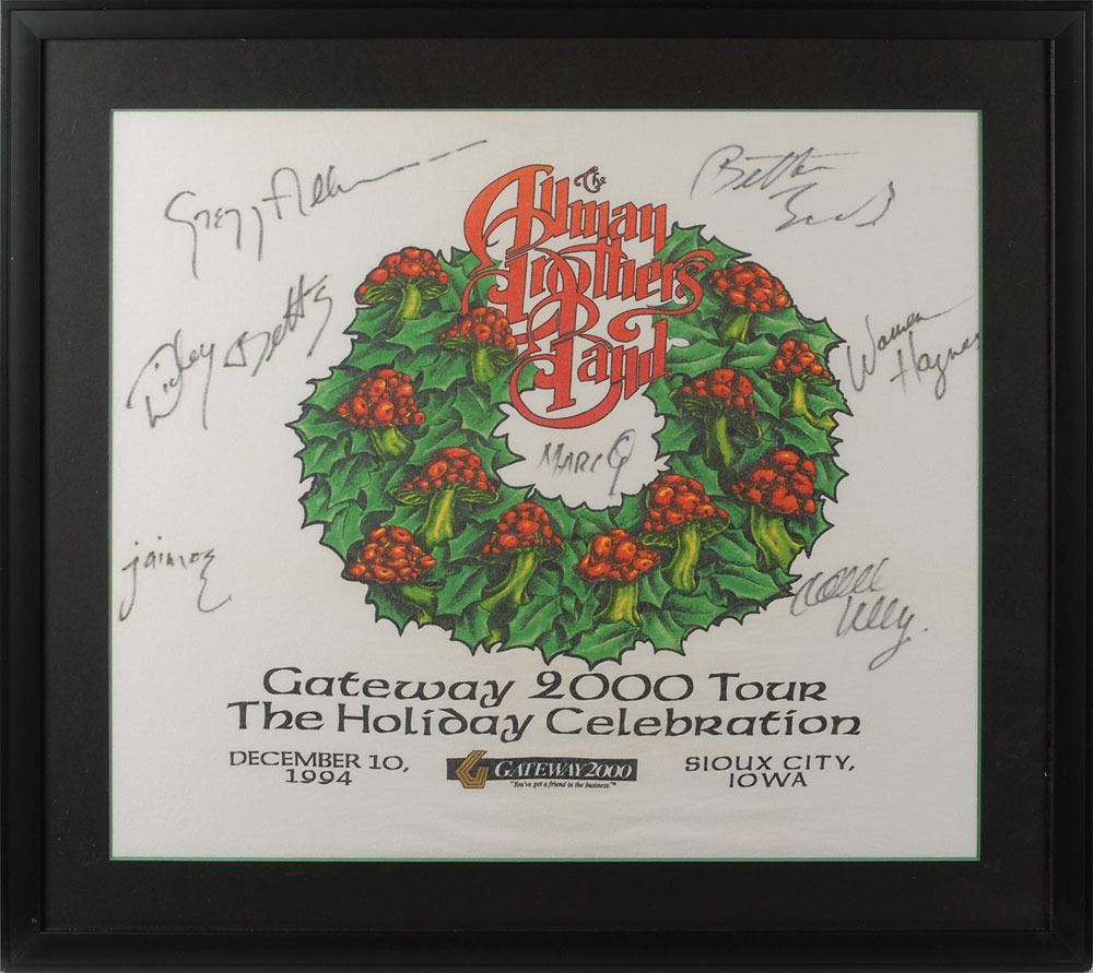 Colorful t-shirt artwork pelon of The Allman Brothers Band logo centered at the top of a wreath consisting of leaves and red mushrooms, reading below, "Gateway 2000 Tour, The Holiday Celebration, December 10, 1994, Sioux City Iowa," 22 x 19, signed in black felt tip by Gregg Allman, Dickey Betts, Jaimoe, Butch Trucks, Warren Haynes, Allen Woody, and Marc Quinones. Matted and framed. In fine condition. Accompanied by a full letter of authenticity from REAL.