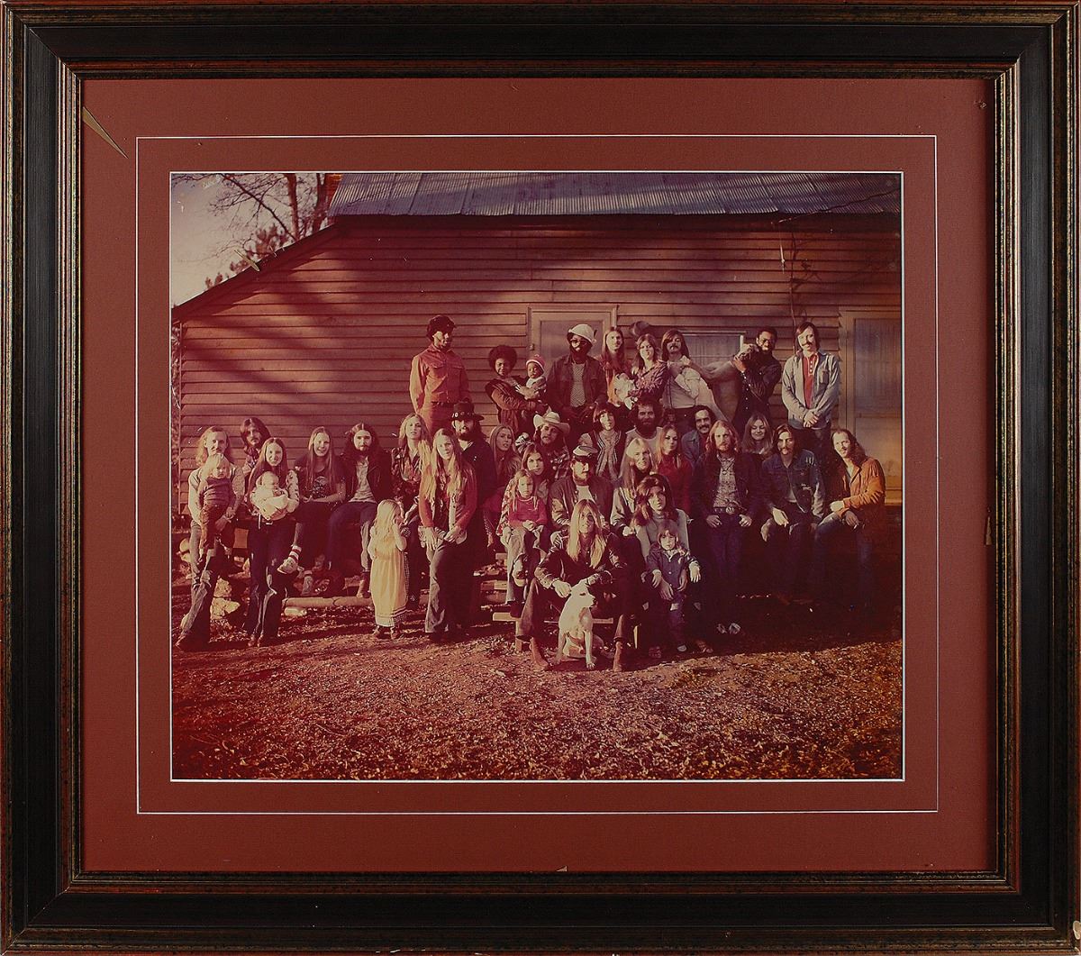 Huge vintage color matte-finish 23.5 x 19.5 group photo of the entire Allman Brothers Band as depicted on the inner gatefold of their 1973 full-length album Brothers and Sisters. Matted and framed to an overall size of 34.75 x 30.75. In fine condition. Consignor notes that this hung in their studio at Capricorn Records and originates from the estate of Phil Walden, agent and founder of Capricorn Records.