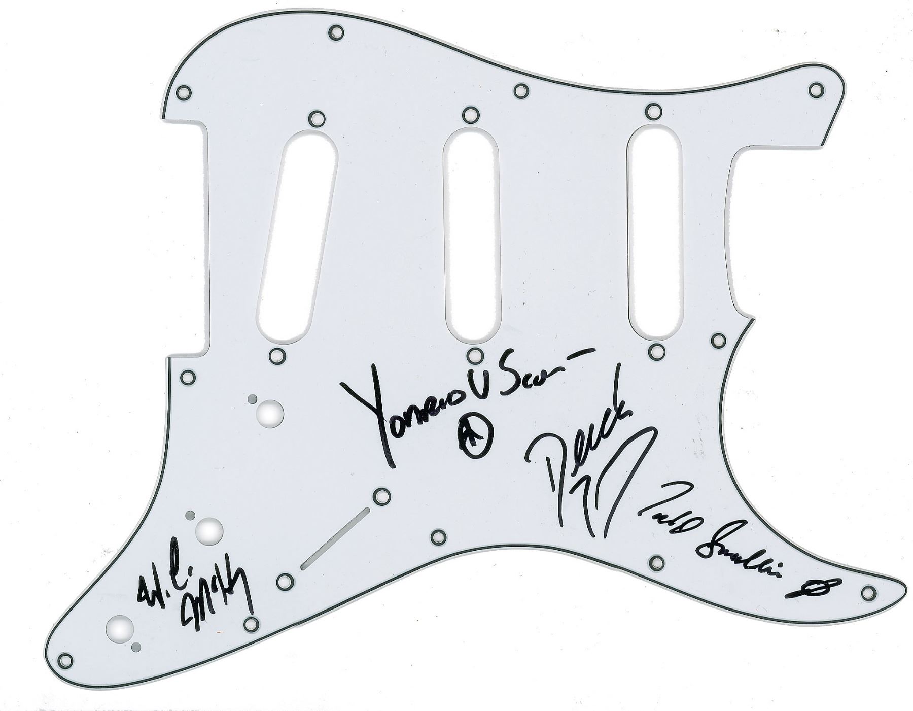 White Stratocaster-style pickguard signed in black felt tip by Derek Trucks, Yonrico Scott, Bill McKay, and Todd Smallie. In fine condition.