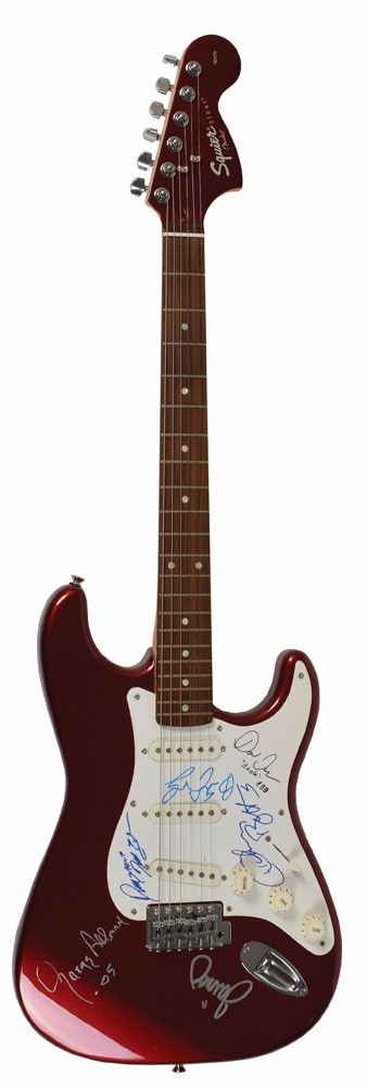 Red sparkle Affinity series Fender Squier Stratocaster electric guitar, signed on the body in silver ink, "Gregg Allman, '05" and "Jaimoe," and on the off-white pickguard in blue felt tip, "Dickey Betts" and "Dangerous Dan Toler," in blue paint pen, "Butch Trucks," and in black felt tip, "David Goldflies, 'Rook,' ABB." In fine condition. Includes a Squier hardshell carrying case.
